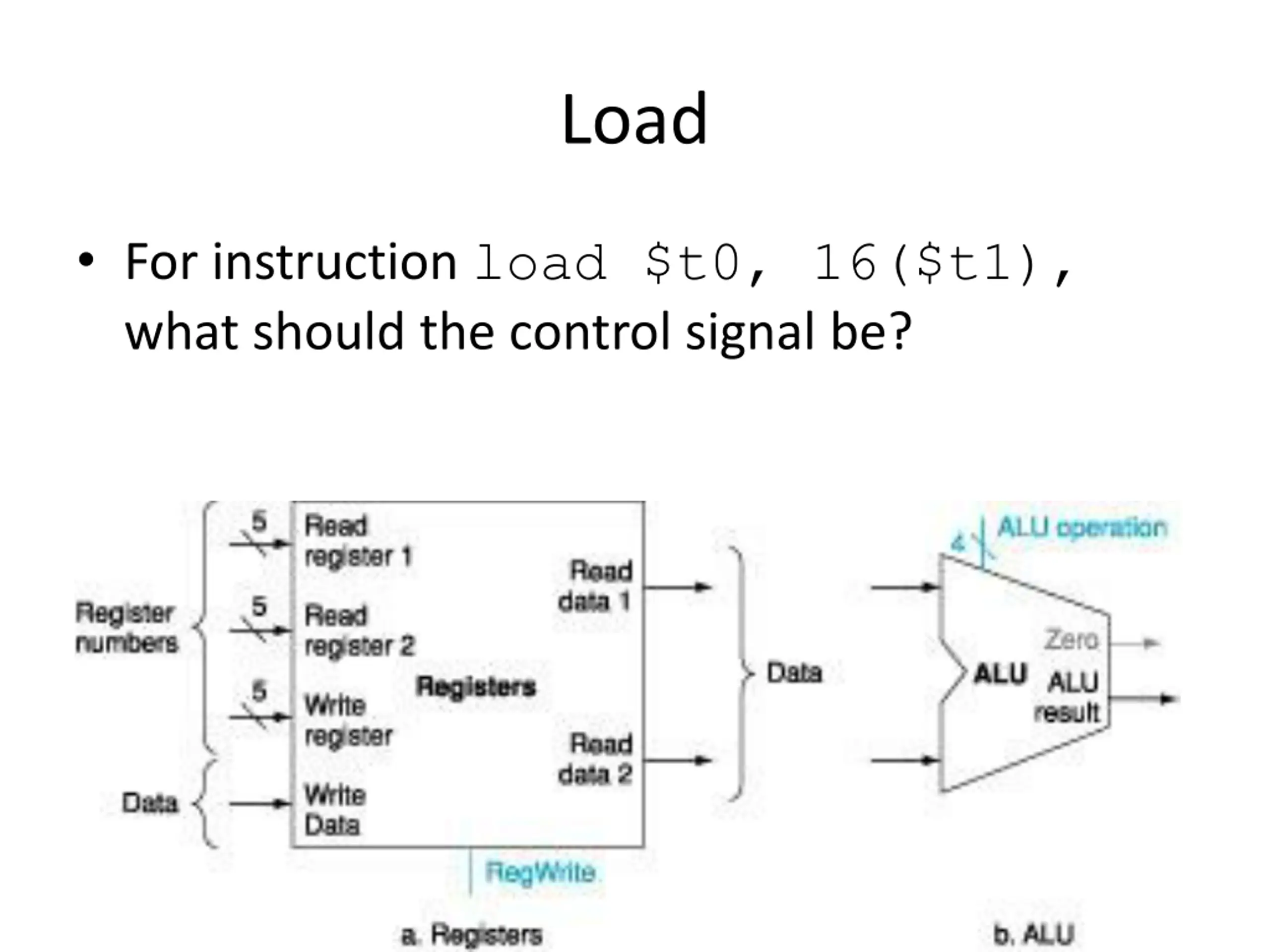 Load For instruction load $t0, 16($t1), what should the control signal be?