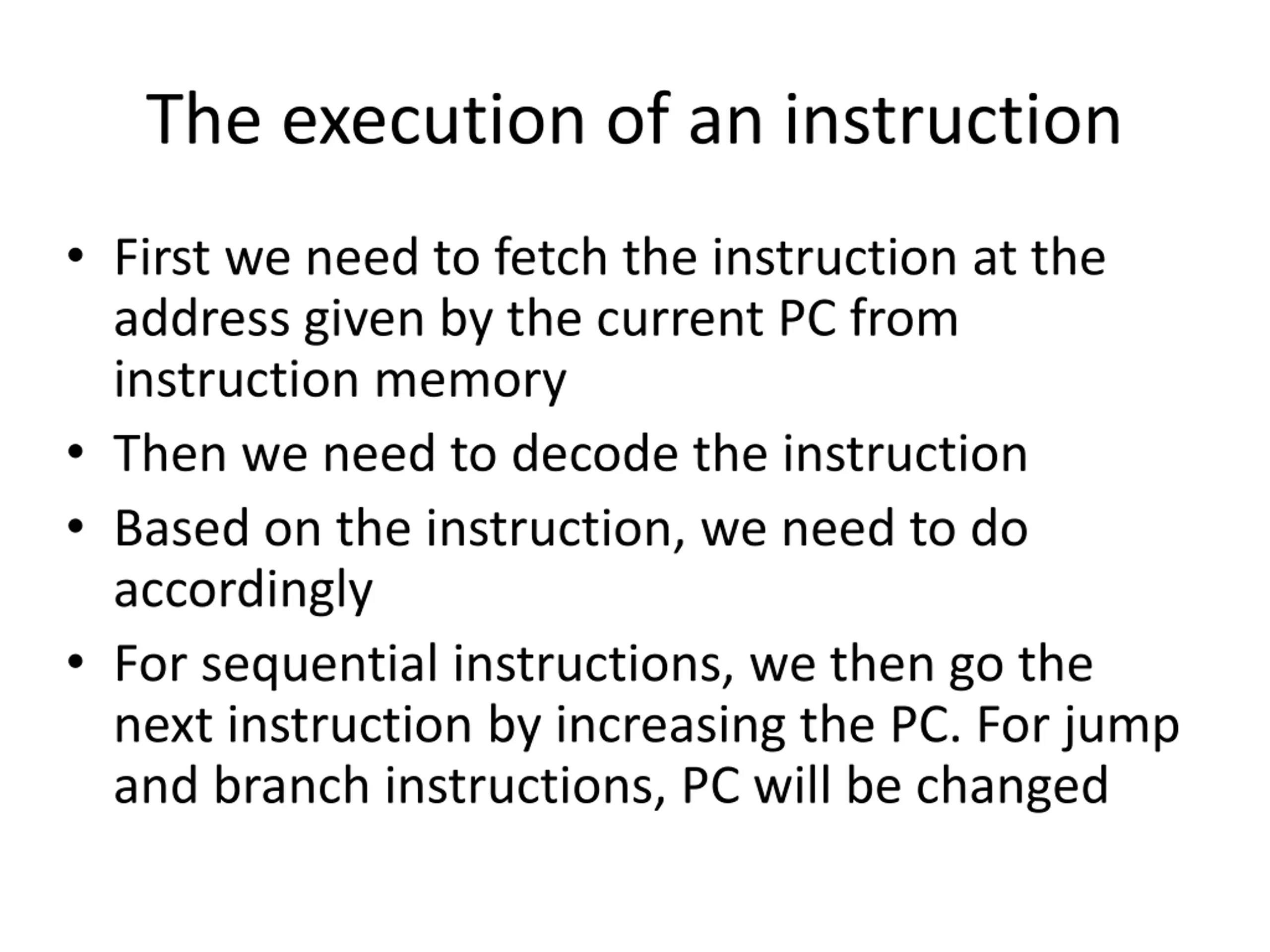 The execution of an instruction First we need to fetch the instruction at the address given by the current PC from instruction memory Then we need to decode the instruction Based on the instruction, we need to do accordingly For sequential instructions, we then go the next instruction by increasing the PC. For jump and branch instructions, PC will be changed