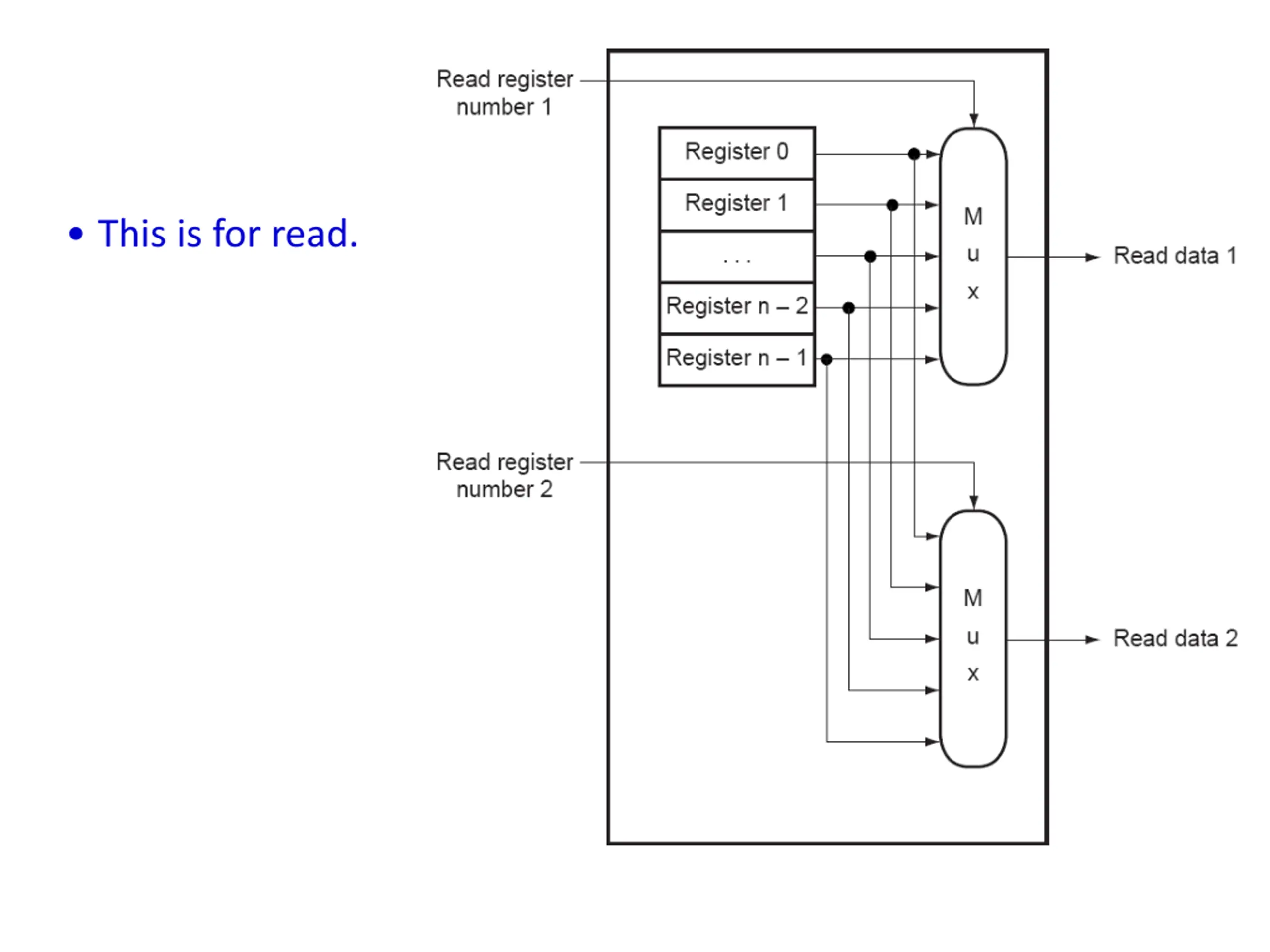 To write to a register The data is connected to every register. Use RegWrite, generate a ``LOAD signal for the register you want to write to. Every register has a LOAD signal. If that signal is `1 , new data will be set. Only the target register s LOAD signal is `1 .