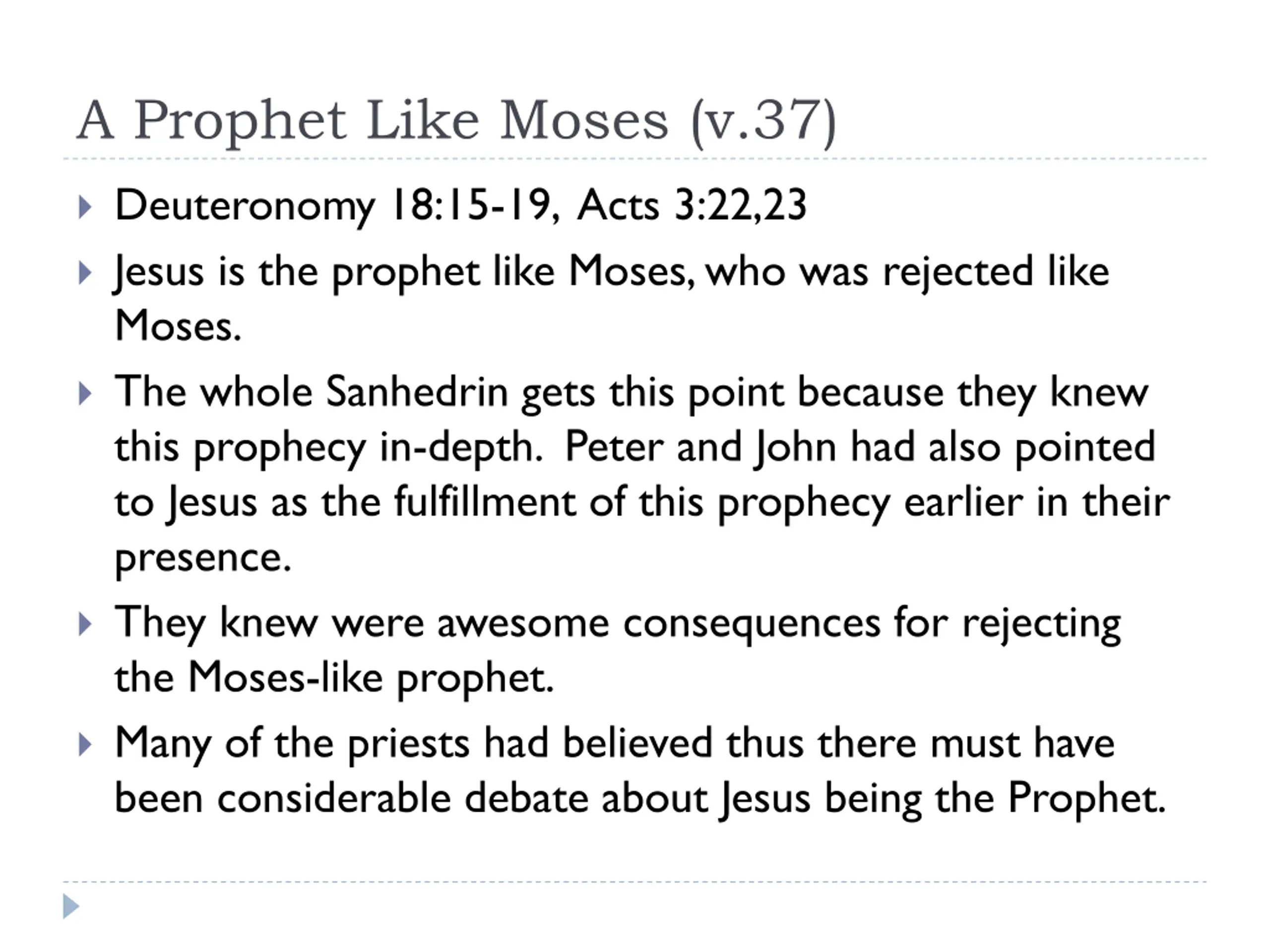 A Prophet Like Moses (v.37) Deuteronomy 18:15-19, Acts 3:22,23 Jesus is the prophet like Moses, who was rejected like Moses. The whole Sanhedrin gets this point because they knew this prophecy in-depth. Peter and John had also pointed to Jesus as the fulfillment of this prophecy earlier in their presence. They knew were awesome consequences for rejecting the Moses-like prophet. Many of the priests had believed thus there must have been considerable debate about Jesus being the Prophet.