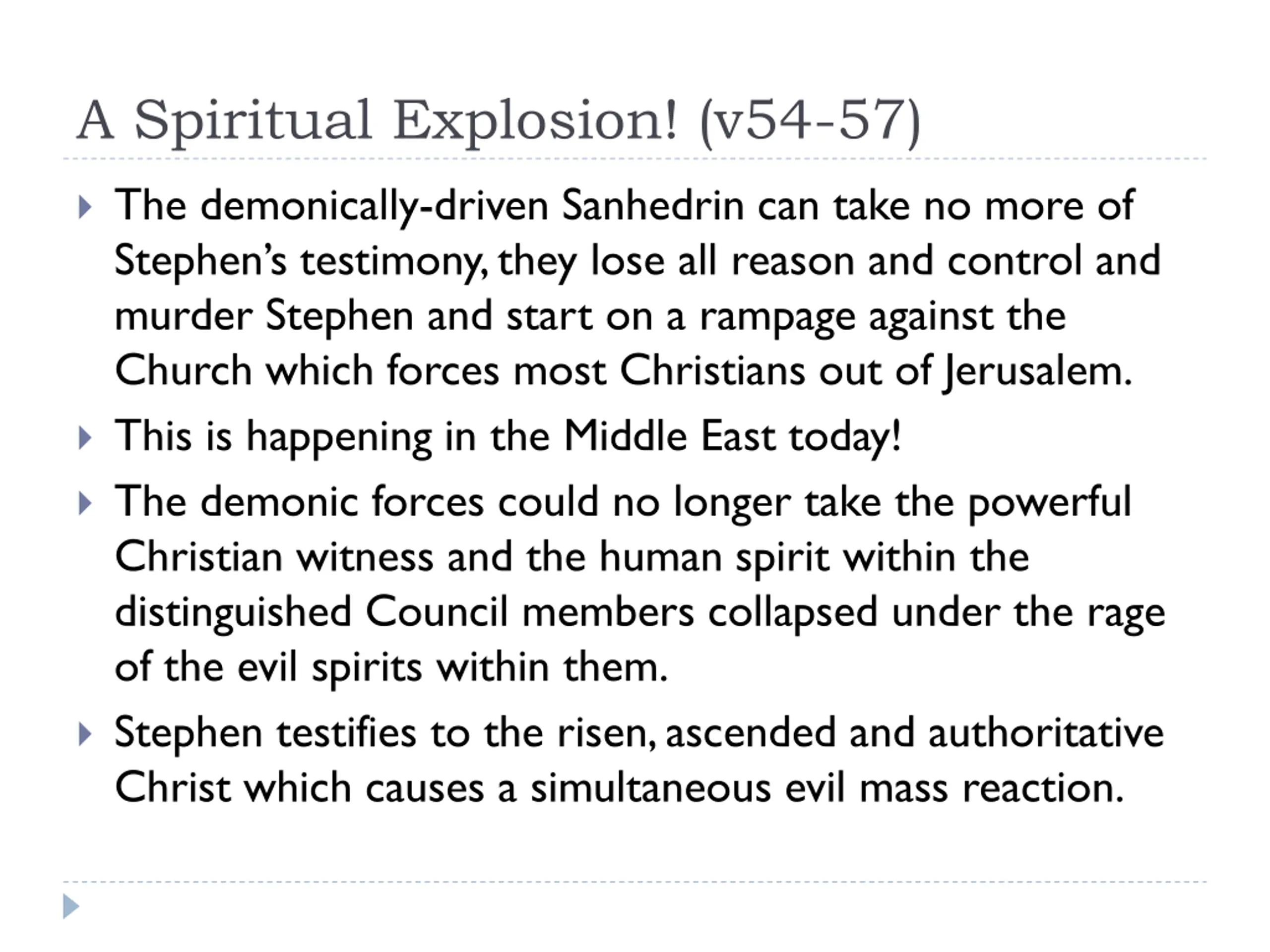 A Spiritual Explosion! (v54-57) The demonically-driven Sanhedrin can take no more of Stephen s testimony, they lose all reason and control and murder Stephen and start on a rampage against the Church which forces most Christians out of Jerusalem. This is happening in the Middle East today! The demonic forces could no longer take the powerful Christian witness and the human spirit within the distinguished Council members collapsed under the rage of the evil spirits within them. Stephen testifies to the risen, ascended and authoritative Christ which causes a simultaneous evil mass reaction.