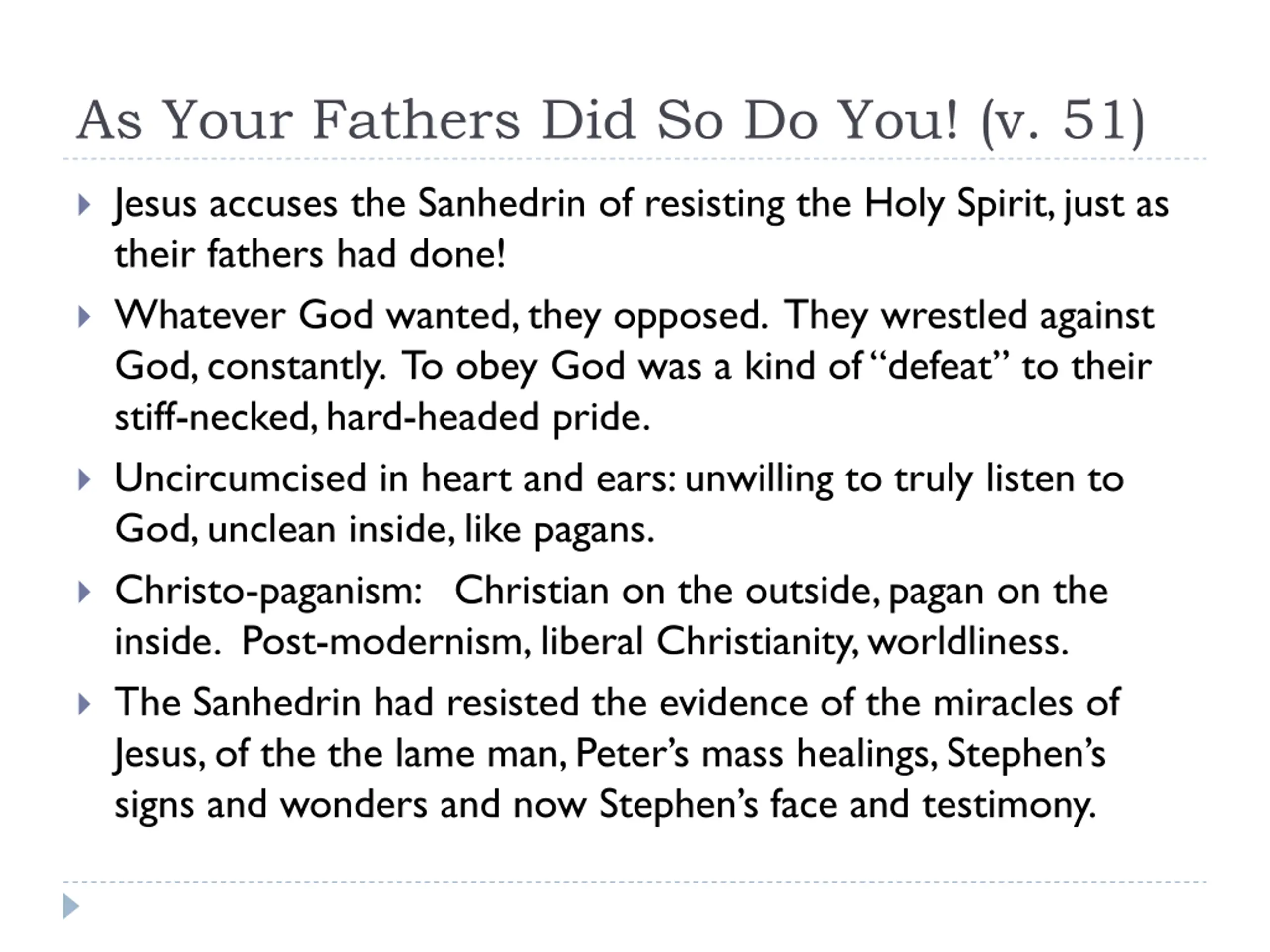 As Your Fathers Did So Do You! (v. 51) Jesus accuses the Sanhedrin of resisting the Holy Spirit, just as their fathers had done! Whatever God wanted, they opposed. They wrestled against God, constantly. To obey God was a kind of defeat to their stiff-necked, hard-headed pride. Uncircumcised in heart and ears: unwilling to truly listen to God, unclean inside, like pagans. Christo-paganism: Christian on the outside, pagan on the inside. Post-modernism, liberal Christianity, worldliness. The Sanhedrin had resisted the evidence of the miracles of Jesus, of the the lame man, Peter s mass healings, Stephen s signs and wonders and now Stephen s face and testimony.