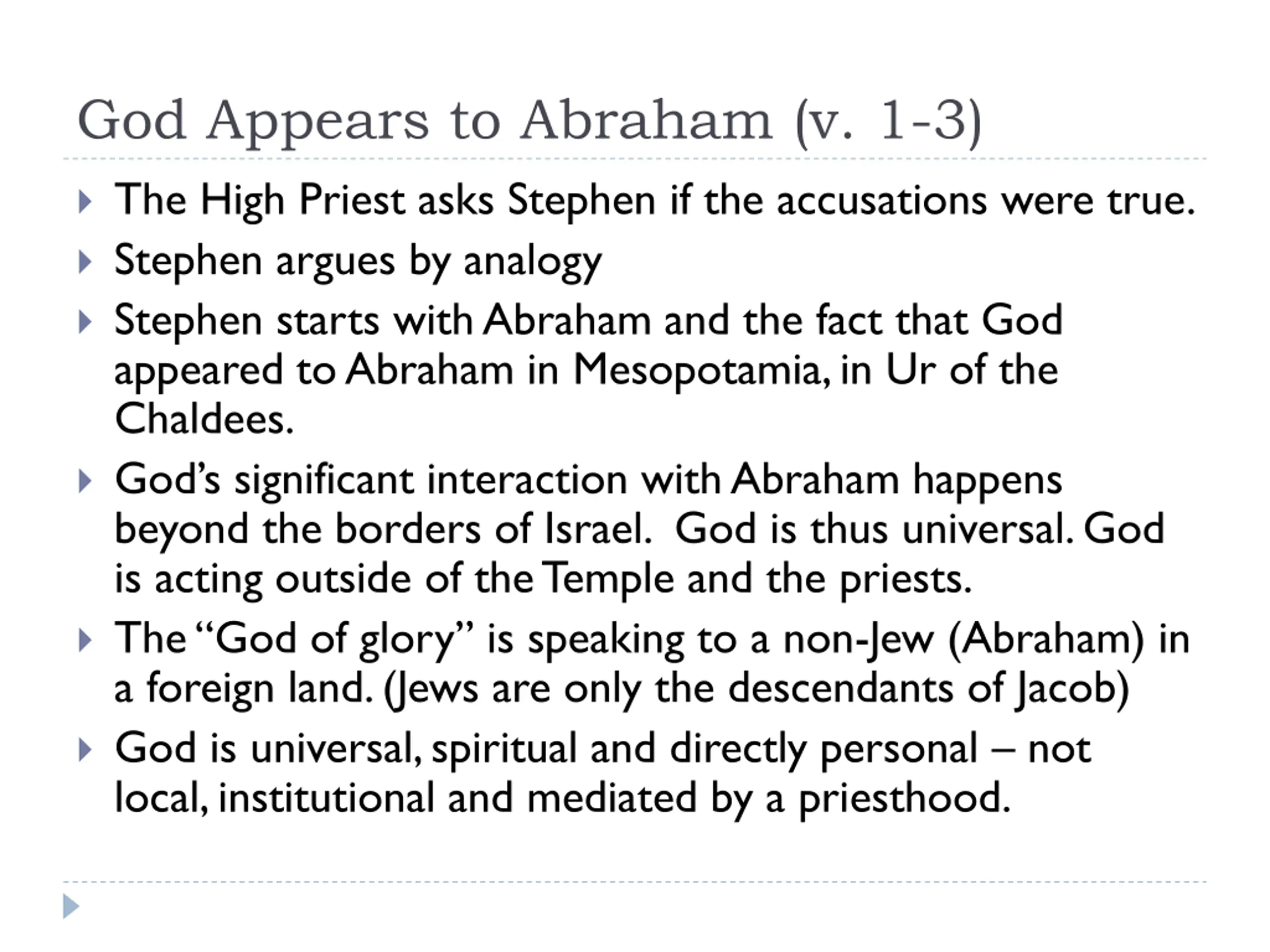 God Appears to Abraham (v. 1-3) The High Priest asks Stephen if the accusations were true. Stephen argues by analogy Stephen starts with Abraham and the fact that God appeared to Abraham in Mesopotamia, in Ur of the Chaldees. God s significant interaction with Abraham happens beyond the borders of Israel. God is thus universal. God is acting outside of the Temple and the priests. The God of glory is speaking to a non-Jew (Abraham) in a foreign land. (Jews are only the descendants of Jacob) God is universal, spiritual and directly personal not local, institutional and mediated by a priesthood.