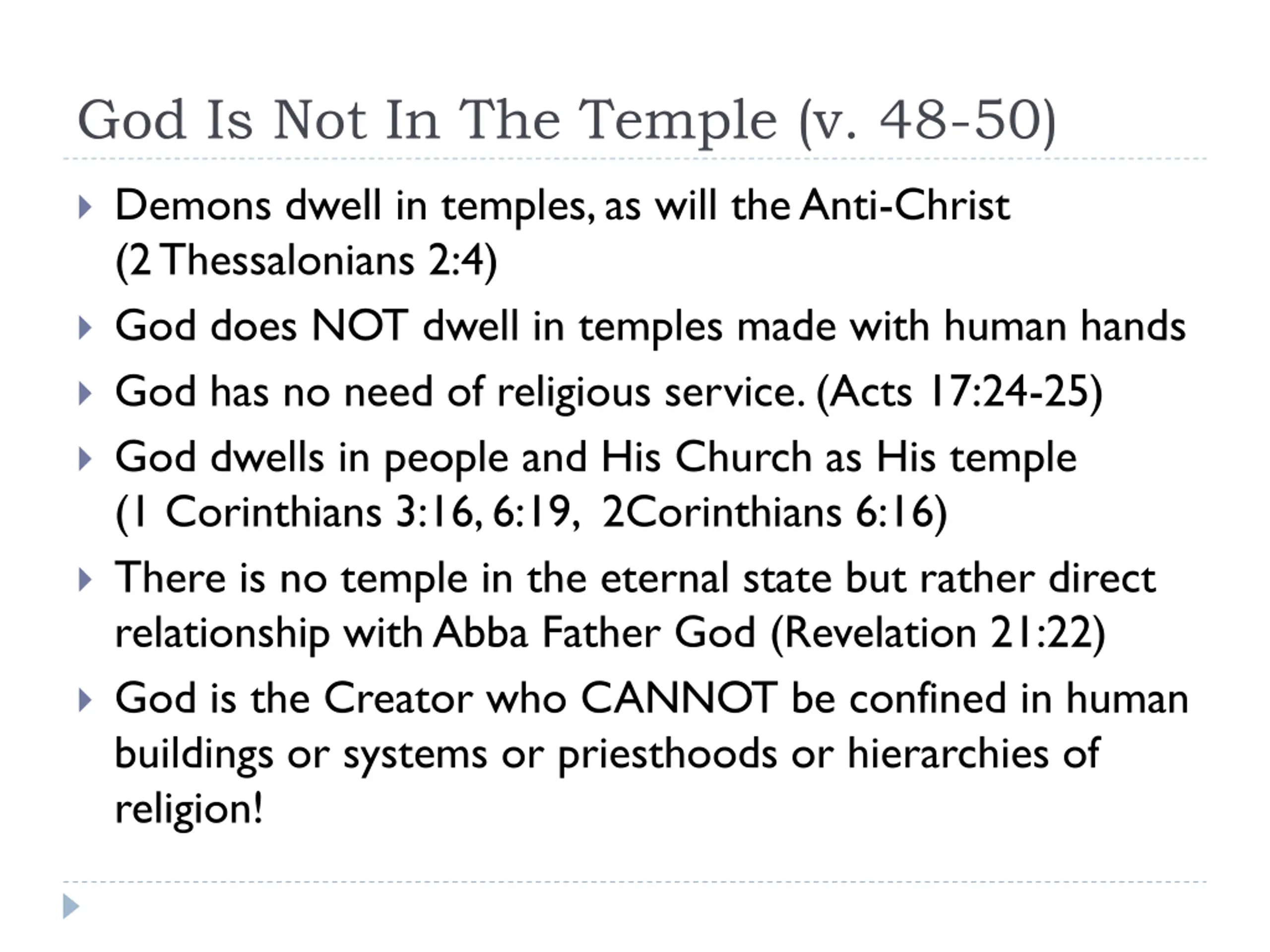 God Is Not In The Temple (v. 48-50) Demons dwell in temples, as will the Anti-Christ (2 Thessalonians 2:4) God does NOT dwell in temples made with human hands God has no need of religious service. (Acts 17:24-25) God dwells in people and His Church as His temple (1 Corinthians 3:16, 6:19, 2Corinthians 6:16) There is no temple in the eternal state but rather direct relationship with Abba Father God (Revelation 21:22) God is the Creator who CANNOT be confined in human buildings or systems or priesthoods or hierarchies of religion!