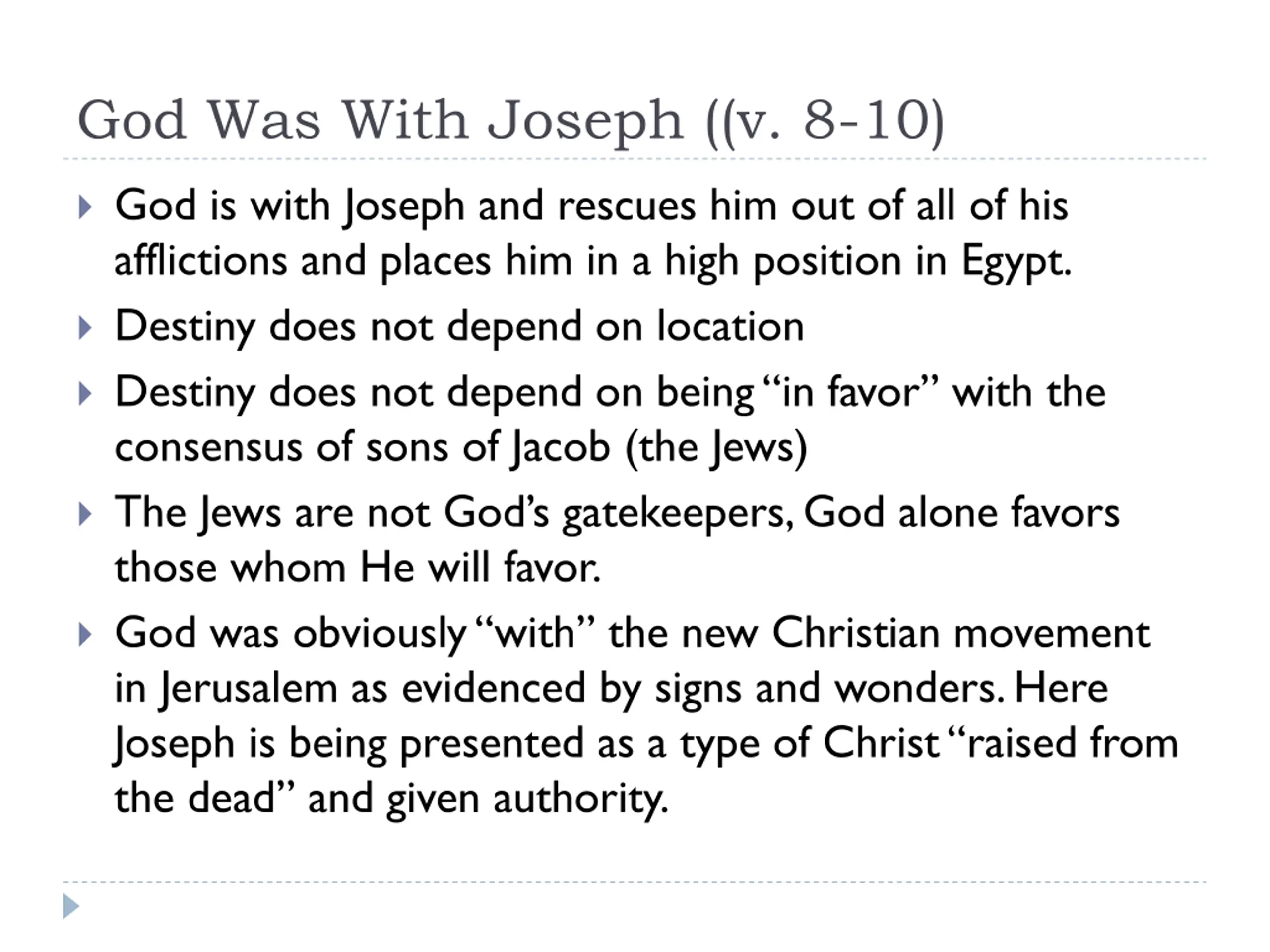 God Was With Joseph ((v. 8-10) God is with Joseph and rescues him out of all of his afflictions and places him in a high position in Egypt. Destiny does not depend on location Destiny does not depend on being in favor with the consensus of sons of Jacob (the Jews) The Jews are not God s gatekeepers, God alone favors those whom He will favor. God was obviously with the new Christian movement in Jerusalem as evidenced by signs and wonders. Here Joseph is being presented as a type of Christ raised from the dead and given authority.