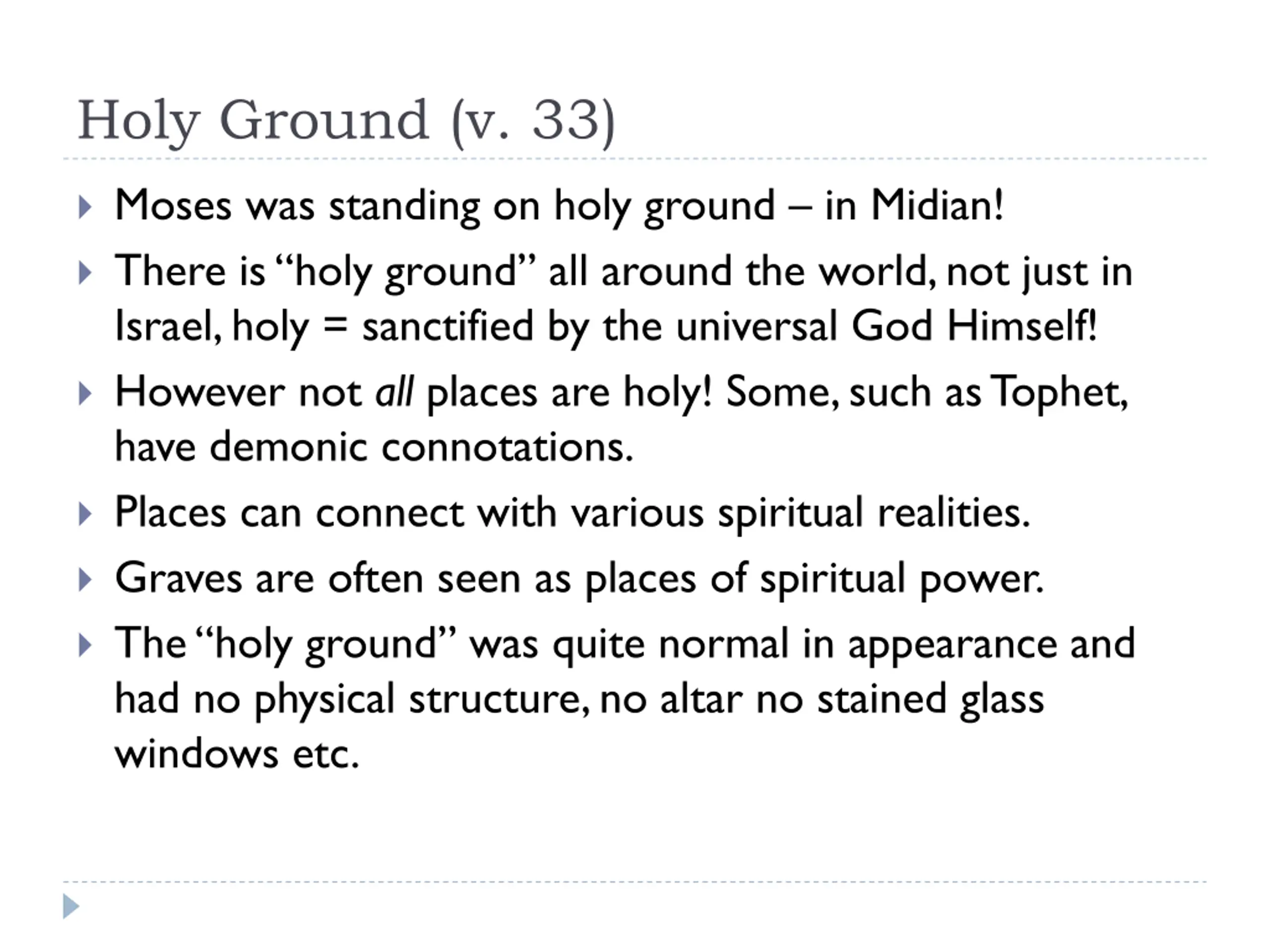 Holy Ground (v. 33) Moses was standing on holy ground in Midian! There is holy ground all around the world, not just in Israel, holy = sanctified by the universal God Himself! However not all places are holy! Some, such as Tophet, have demonic connotations. Places can connect with various spiritual realities. Graves are often seen as places of spiritual power. The holy ground was quite normal in appearance and had no physical structure, no altar no stained glass windows etc.
