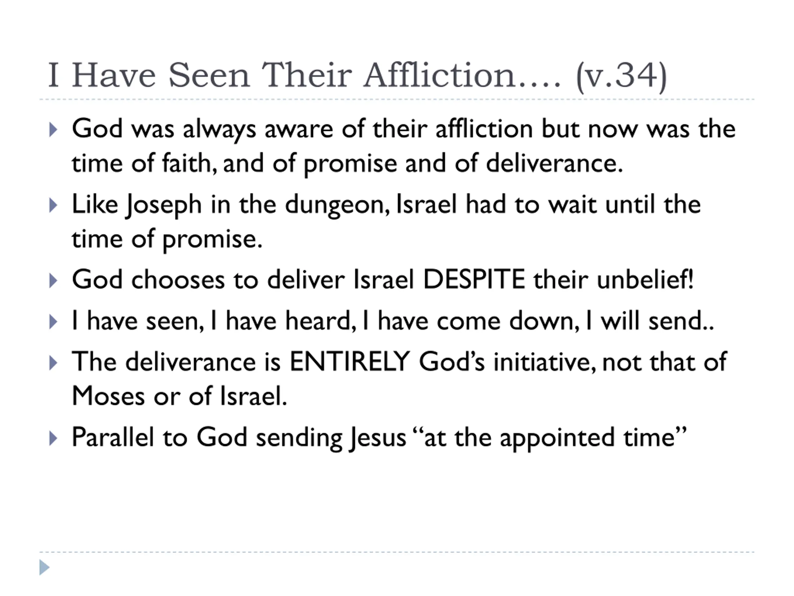 I Have Seen Their Affliction. (v.34) God was always aware of their affliction but now was the time of faith, and of promise and of deliverance. Like Joseph in the dungeon, Israel had to wait until the time of promise. God chooses to deliver Israel DESPITE their unbelief! I have seen, I have heard, I have come down, I will send.. The deliverance is ENTIRELY God s initiative, not that of Moses or of Israel. Parallel to God sending Jesus at the appointed time