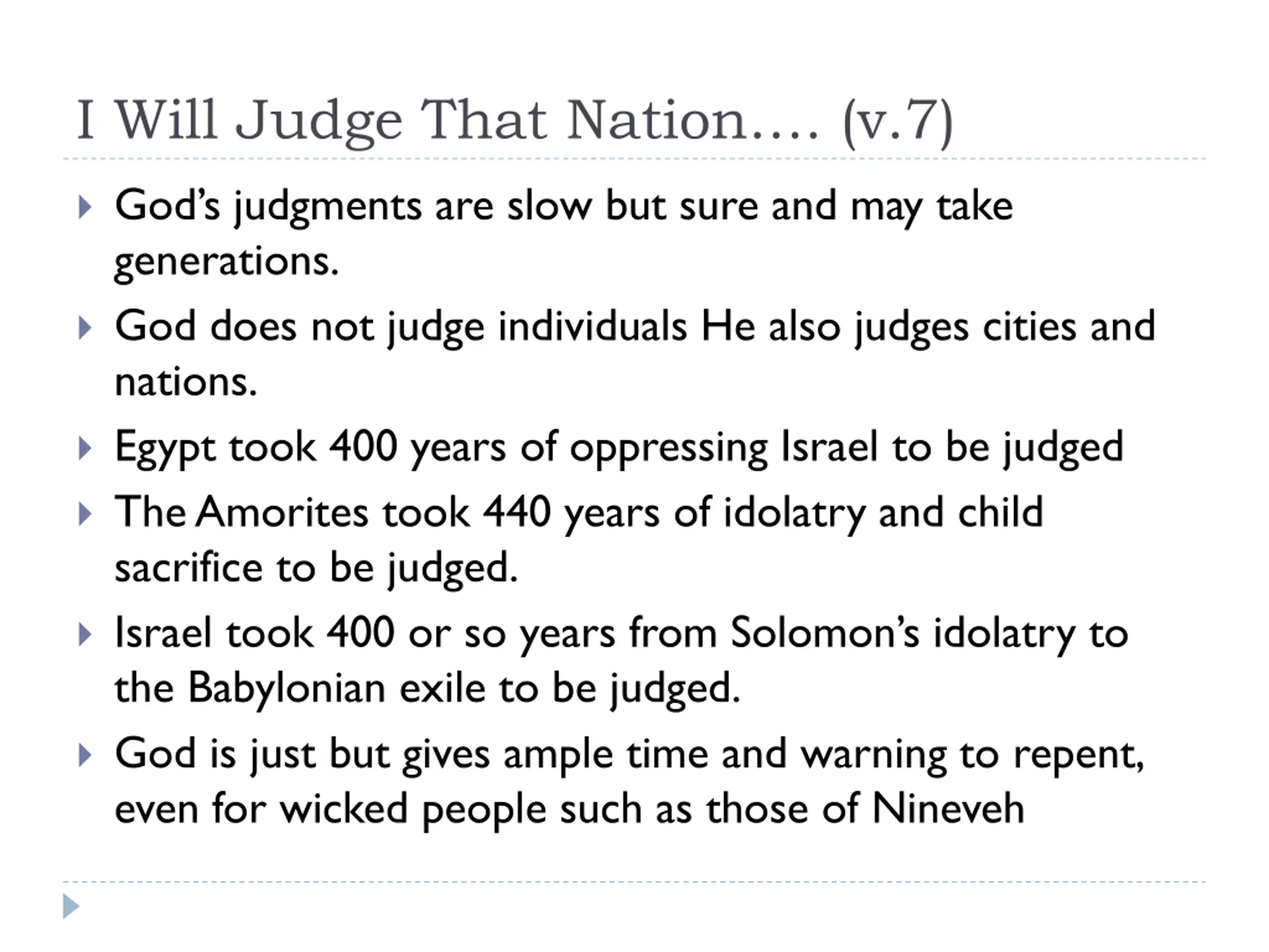 I Will Judge That Nation. (v.7) God s judgments are slow but sure and may take generations. God does not judge individuals He also judges cities and nations. Egypt took 400 years of oppressing Israel to be judged The Amorites took 440 years of idolatry and child sacrifice to be judged. Israel took 400 or so years from Solomon s idolatry to the Babylonian exile to be judged. God is just but gives ample time and warning to repent, even for wicked people such as those of Nineveh