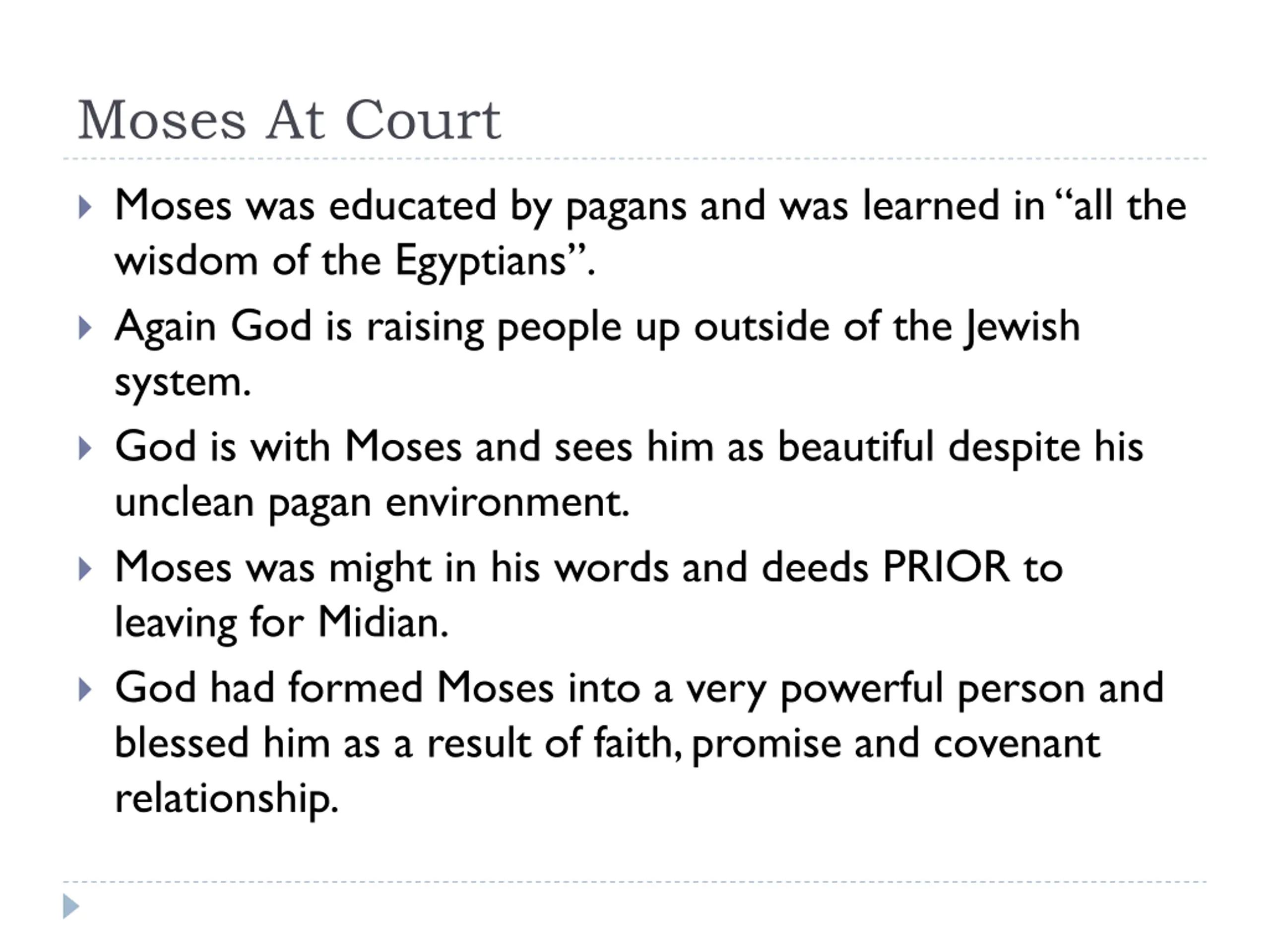 Moses At Court Moses was educated by pagans and was learned in all the wisdom of the Egyptians . Again God is raising people up outside of the Jewish system. God is with Moses and sees him as beautiful despite his unclean pagan environment. Moses was might in his words and deeds PRIOR to leaving for Midian. God had formed Moses into a very powerful person and blessed him as a result of faith, promise and covenant relationship.