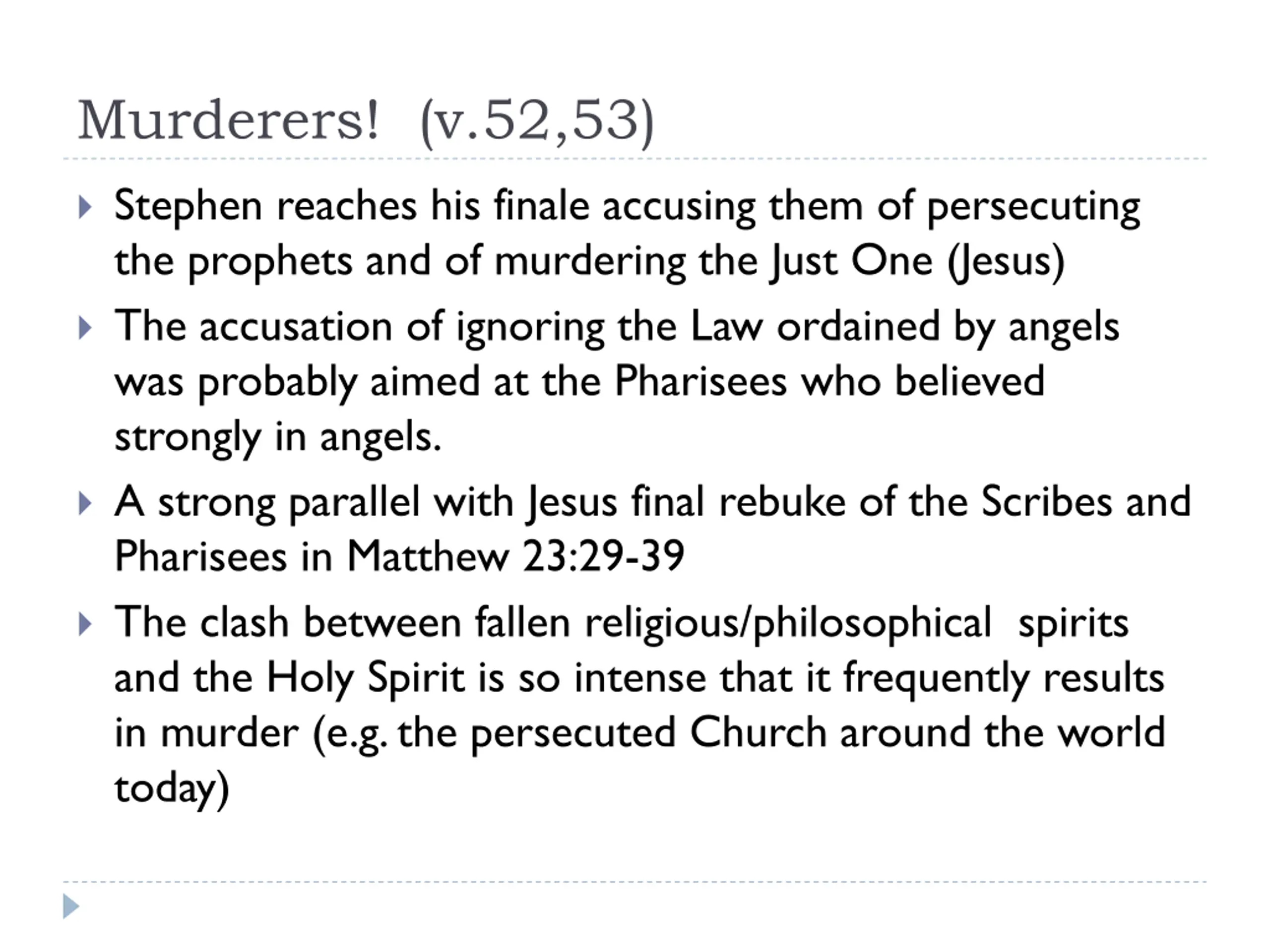 Murderers! (v.52,53) Stephen reaches his finale accusing them of persecuting the prophets and of murdering the Just One (Jesus) The accusation of ignoring the Law ordained by angels was probably aimed at the Pharisees who believed strongly in angels. A strong parallel with Jesus final rebuke of the Scribes and Pharisees in Matthew 23:29-39 The clash between fallen religious/philosophical spirits and the Holy Spirit is so intense that it frequently results in murder (e.g. the persecuted Church around the world today)