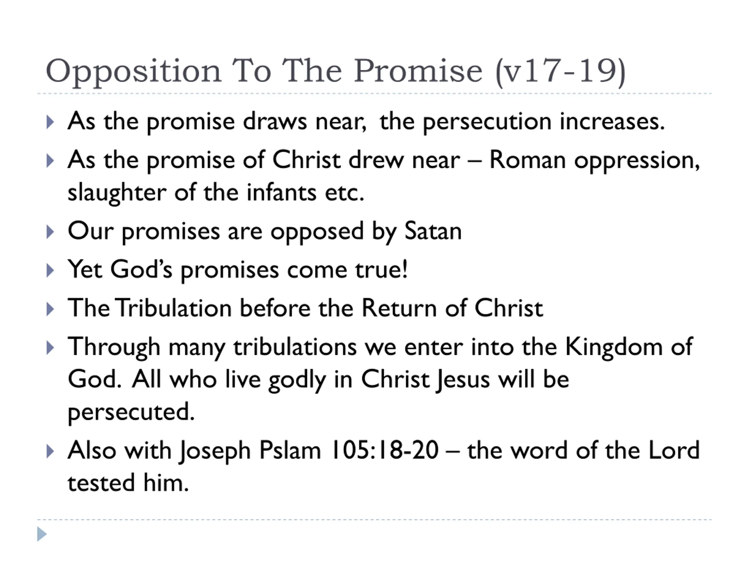 Opposition To The Promise (v17-19) As the promise draws near, the persecution increases. As the promise of Christ drew near Roman oppression, slaughter of the infants etc. Our promises are opposed by Satan Yet God s promises come true! The Tribulation before the Return of Christ Through many tribulations we enter into the Kingdom of God. All who live godly in Christ Jesus will be persecuted. Also with Joseph Pslam 105:18-20 the word of the Lord tested him.