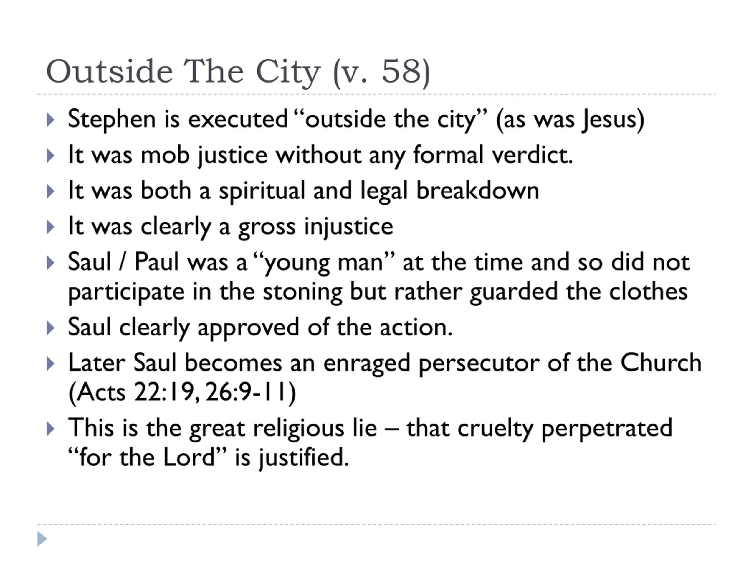 Outside The City (v. 58) Stephen is executed outside the city (as was Jesus) It was mob justice without any formal verdict. It was both a spiritual and legal breakdown It was clearly a gross injustice Saul / Paul was a young man at the time and so did not participate in the stoning but rather guarded the clothes Saul clearly approved of the action. Later Saul becomes an enraged persecutor of the Church (Acts 22:19, 26:9-11) This is the great religious lie that cruelty perpetrated for the Lord is justified.