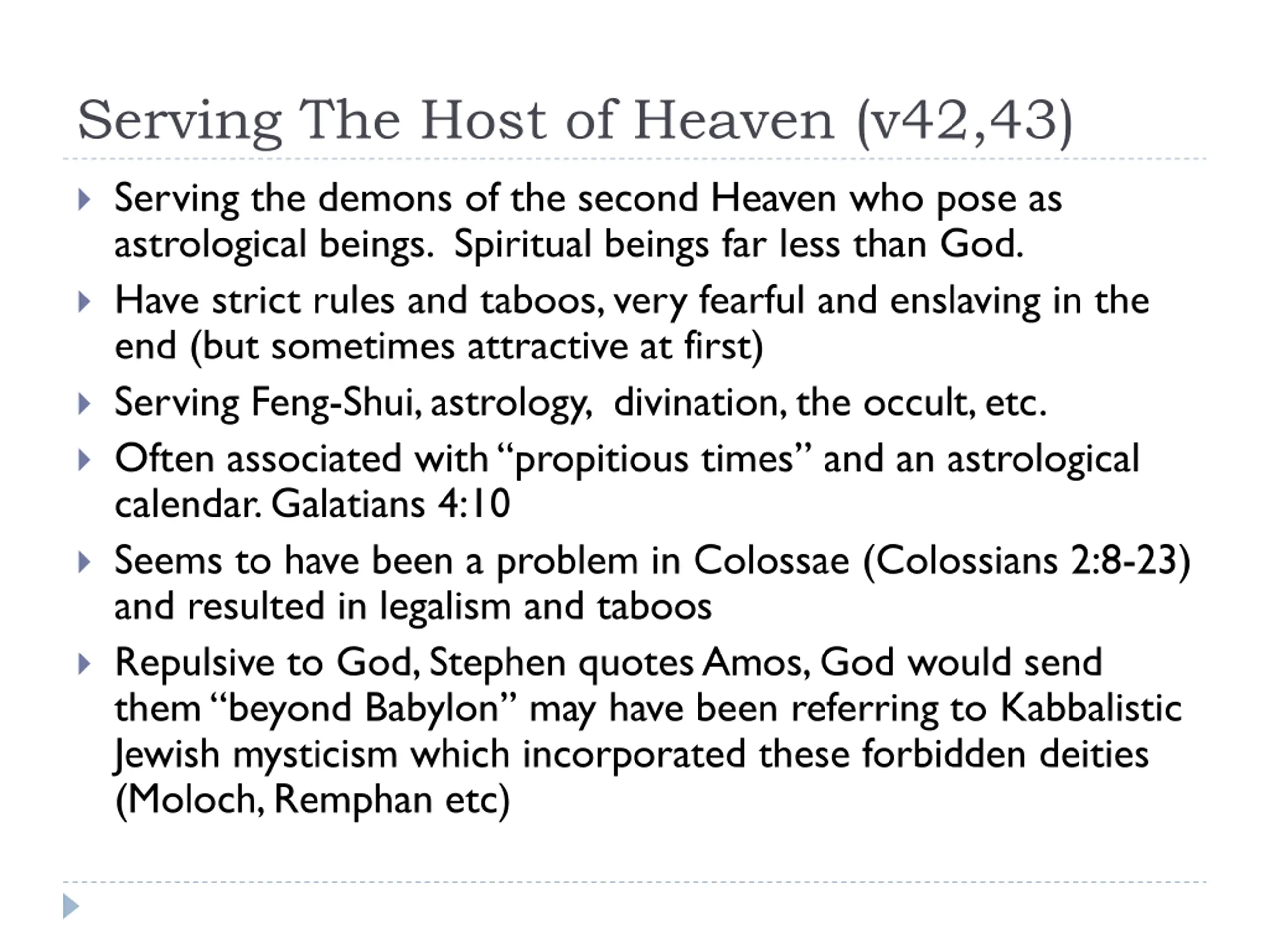 Serving The Host of Heaven (v42,43) Serving the demons of the second Heaven who pose as astrological beings. Spiritual beings far less than God. Have strict rules and taboos, very fearful and enslaving in the end (but sometimes attractive at first) Serving Feng-Shui, astrology, divination, the occult, etc. Often associated with propitious times and an astrological calendar. Galatians 4:10 Seems to have been a problem in Colossae (Colossians 2:8-23) and resulted in legalism and taboos Repulsive to God, Stephen quotes Amos, God would send them beyond Babylon may have been referring to Kabbalistic Jewish mysticism which incorporated these forbidden deities (Moloch, Remphan etc)