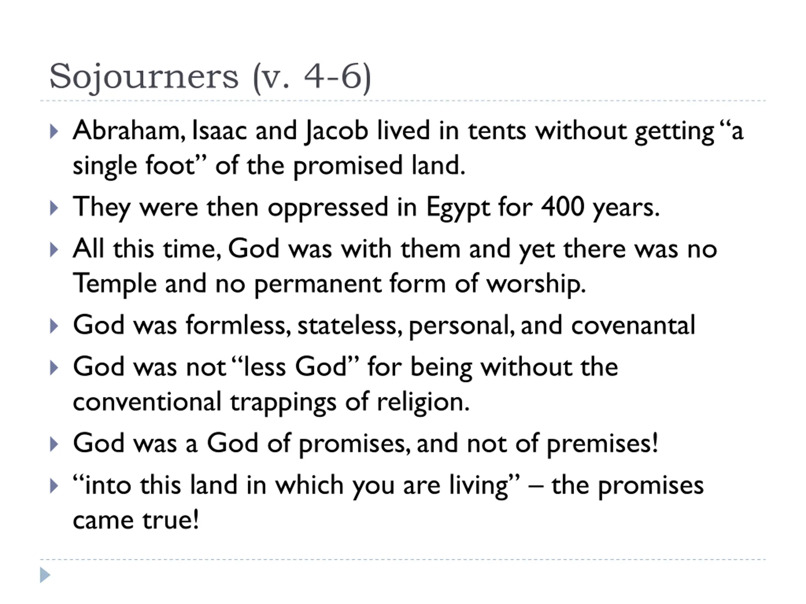 Sojourners (v. 4-6) Abraham, Isaac and Jacob lived in tents without getting a single foot of the promised land. They were then oppressed in Egypt for 400 years. All this time, God was with them and yet there was no Temple and no permanent form of worship. God was formless, stateless, personal, and covenantal God was not less God for being without the conventional trappings of religion. God was a God of promises, and not of premises! into this land in which you are living the promises came true!