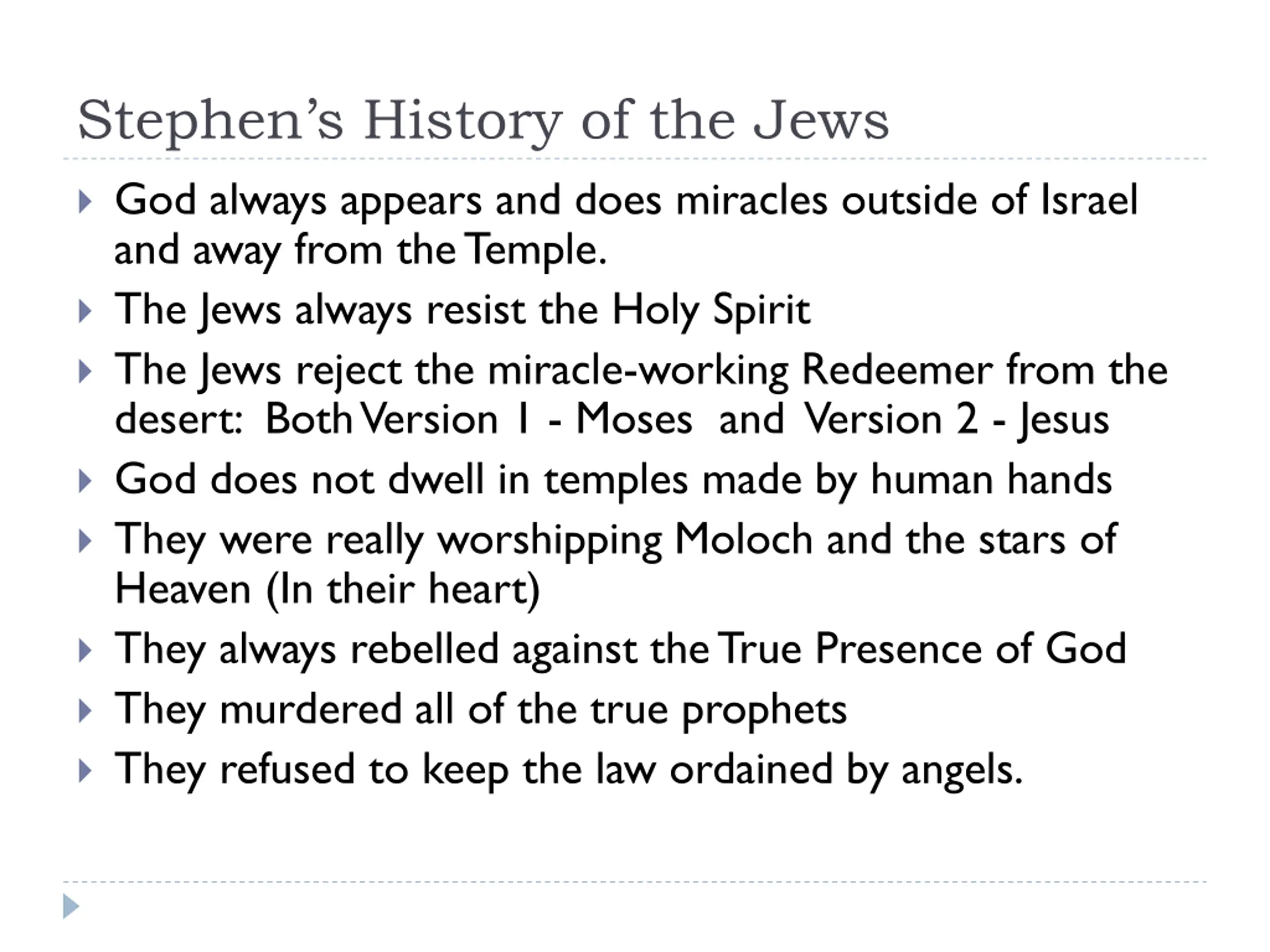 Stephens History of the Jews God always appears and does miracles outside of Israel and away from the Temple. The Jews always resist the Holy Spirit The Jews reject the miracle-working Redeemer from the desert: Both Version 1 - Moses and Version 2 - Jesus God does not dwell in temples made by human hands They were really worshipping Moloch and the stars of Heaven (In their heart) They always rebelled against the True Presence of God They murdered all of the true prophets They refused to keep the law ordained by angels.