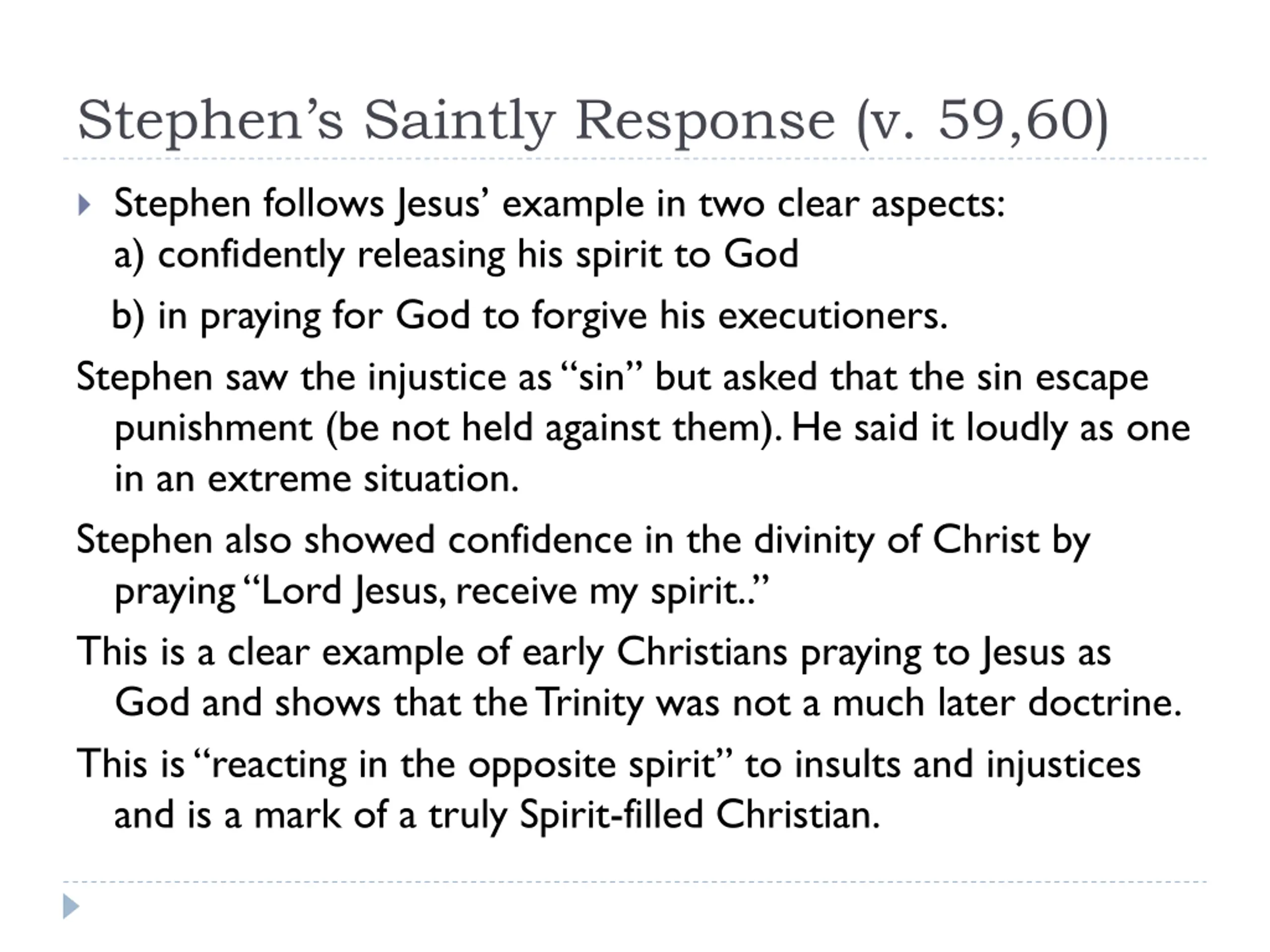 Stephens Saintly Response (v. 59,60) Stephen follows Jesus example in two clear aspects: a) confidently releasing his spirit to God b) in praying for God to forgive his executioners. Stephen saw the injustice as sin but asked that the sin escape punishment (be not held against them). He said it loudly as one in an extreme situation. Stephen also showed confidence in the divinity of Christ by praying Lord Jesus, receive my spirit.. This is a clear example of early Christians praying to Jesus as God and shows that the Trinity was not a much later doctrine. This is reacting in the opposite spirit to insults and injustices and is a mark of a truly Spirit-filled Christian.
