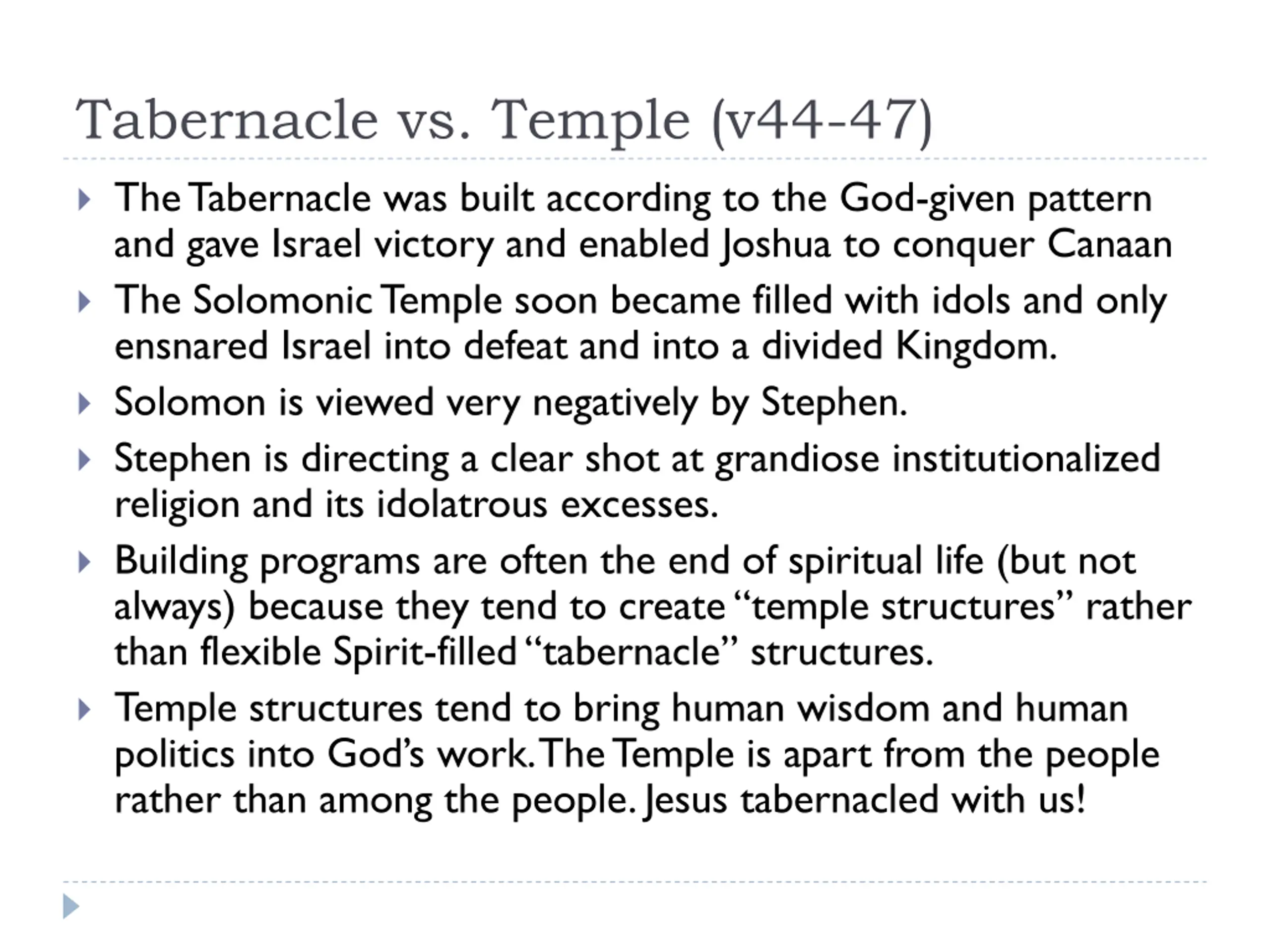 Tabernacle vs. Temple (v44-47) The Tabernacle was built according to the God-given pattern and gave Israel victory and enabled Joshua to conquer Canaan The SolomonicTemple soon became filled with idols and only ensnared Israel into defeat and into a divided Kingdom. Solomon is viewed very negatively by Stephen. Stephen is directing a clear shot at grandiose institutionalized religion and its idolatrous excesses. Building programs are often the end of spiritual life (but not always) because they tend to create temple structures rather than flexible Spirit-filled tabernacle structures. Temple structures tend to bring human wisdom and human politics into God s work. The Temple is apart from the people rather than among the people. Jesus tabernacled with us!