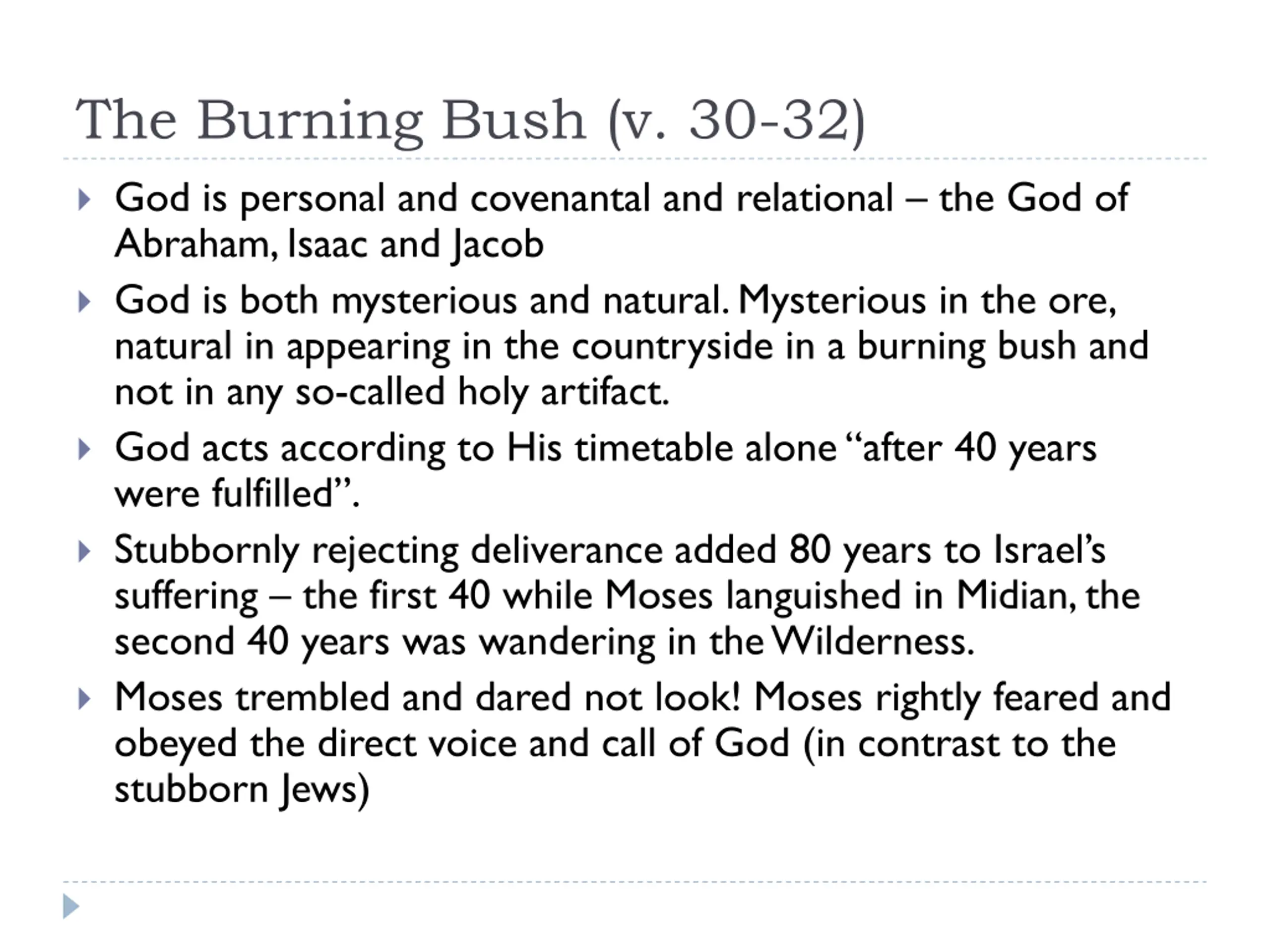 The Burning Bush (v. 30-32) God is personal and covenantal and relational the God of Abraham, Isaac and Jacob God is both mysterious and natural. Mysterious in the ore, natural in appearing in the countryside in a burning bush and not in any so-called holy artifact. God acts according to His timetable alone after 40 years were fulfilled . Stubbornly rejecting deliverance added 80 years to Israel s suffering the first 40 while Moses languished in Midian, the second 40 years was wandering in the Wilderness. Moses trembled and dared not look! Moses rightly feared and obeyed the direct voice and call of God (in contrast to the stubborn Jews)