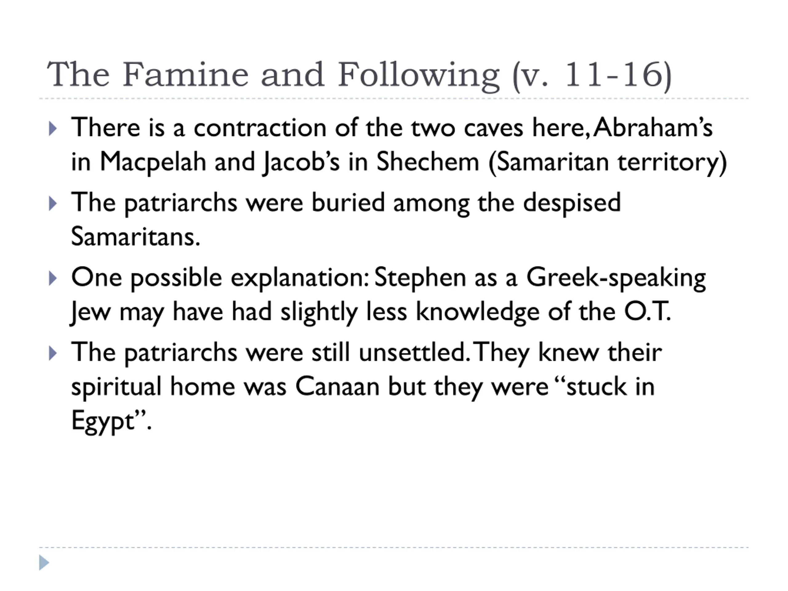 The Famine and Following (v. 11-16) There is a contraction of the two caves here, Abraham s in Macpelah and Jacob s in Shechem (Samaritan territory) The patriarchs were buried among the despised Samaritans. One possible explanation: Stephen as a Greek-speaking Jew may have had slightly less knowledge of the O.T. The patriarchs were still unsettled. They knew their spiritual home was Canaan but they were stuck in Egypt .
