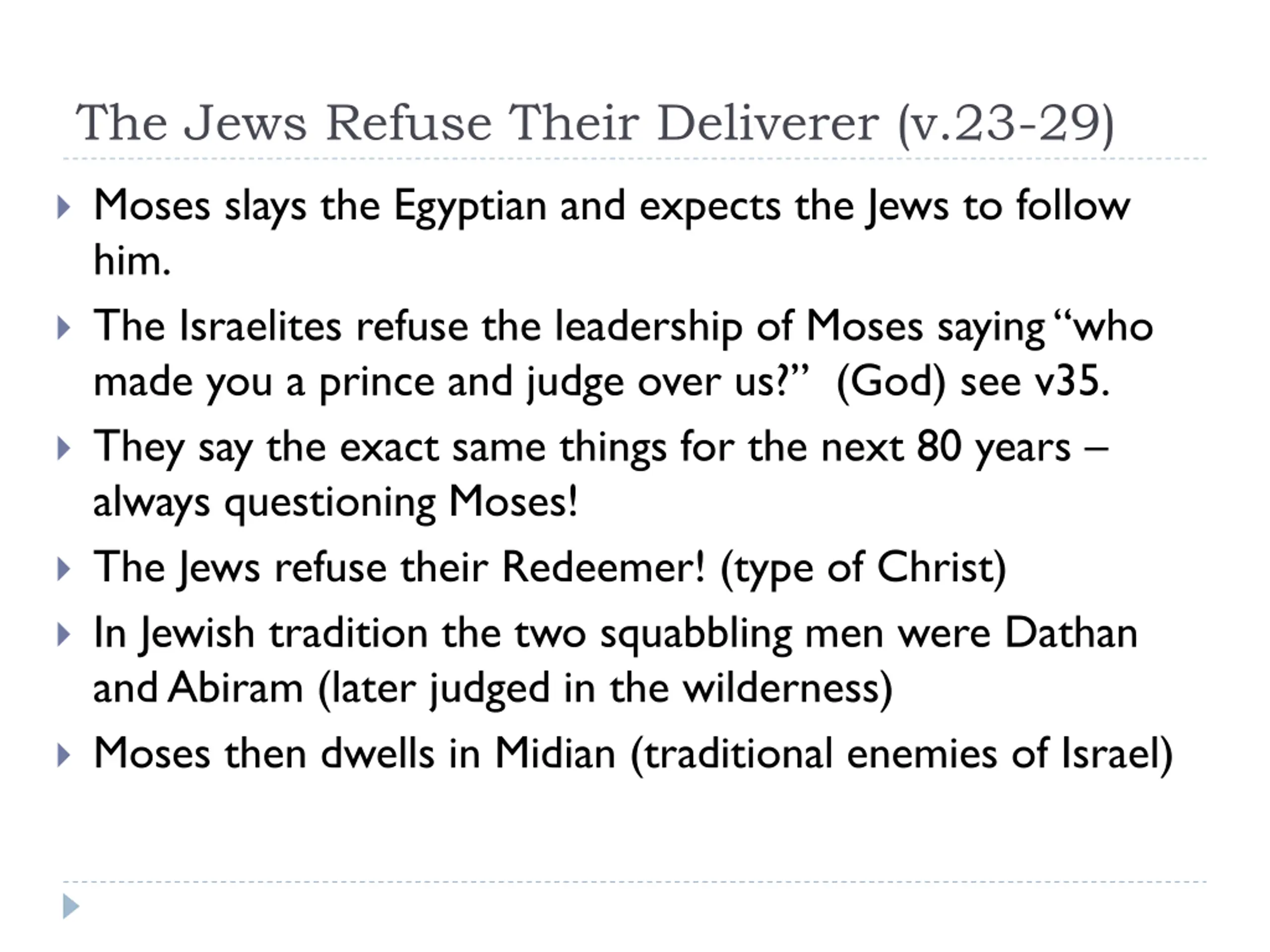 The Jews Refuse Their Deliverer (v.23-29) Moses slays the Egyptian and expects the Jews to follow him. The Israelites refuse the leadership of Moses saying who made you a prince and judge over us? (God) see v35. They say the exact same things for the next 80 years always questioning Moses! The Jews refuse their Redeemer! (type of Christ) In Jewish tradition the two squabbling men were Dathan and Abiram (later judged in the wilderness) Moses then dwells in Midian (traditional enemies of Israel)