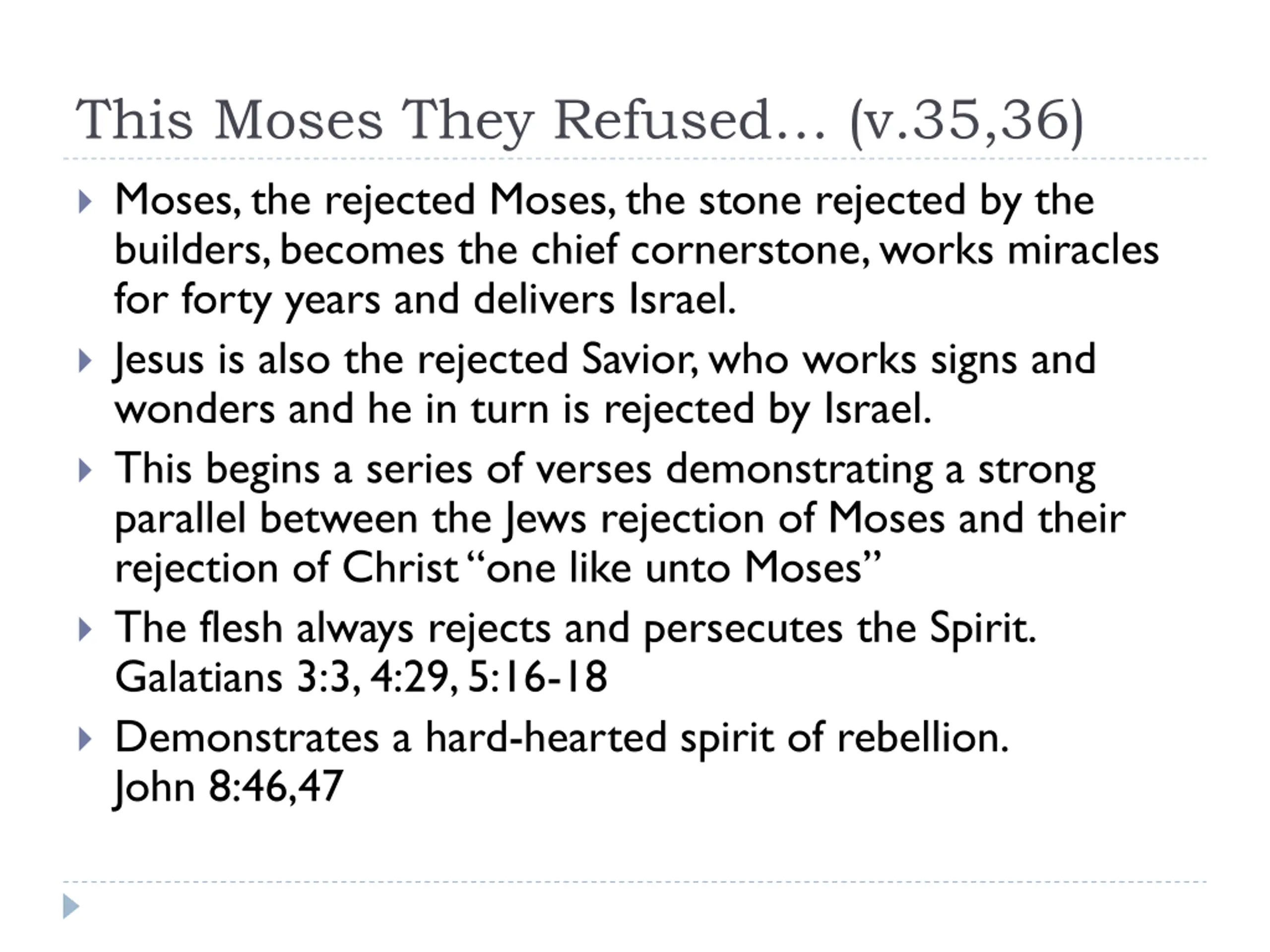 This Moses They Refused (v.35,36) Moses, the rejected Moses, the stone rejected by the builders, becomes the chief cornerstone, works miracles for forty years and delivers Israel. Jesus is also the rejected Savior, who works signs and wonders and he in turn is rejected by Israel. This begins a series of verses demonstrating a strong parallel between the Jews rejection of Moses and their rejection of Christ one like unto Moses The flesh always rejects and persecutes the Spirit. Galatians 3:3, 4:29, 5:16-18 Demonstrates a hard-hearted spirit of rebellion. John 8:46,47