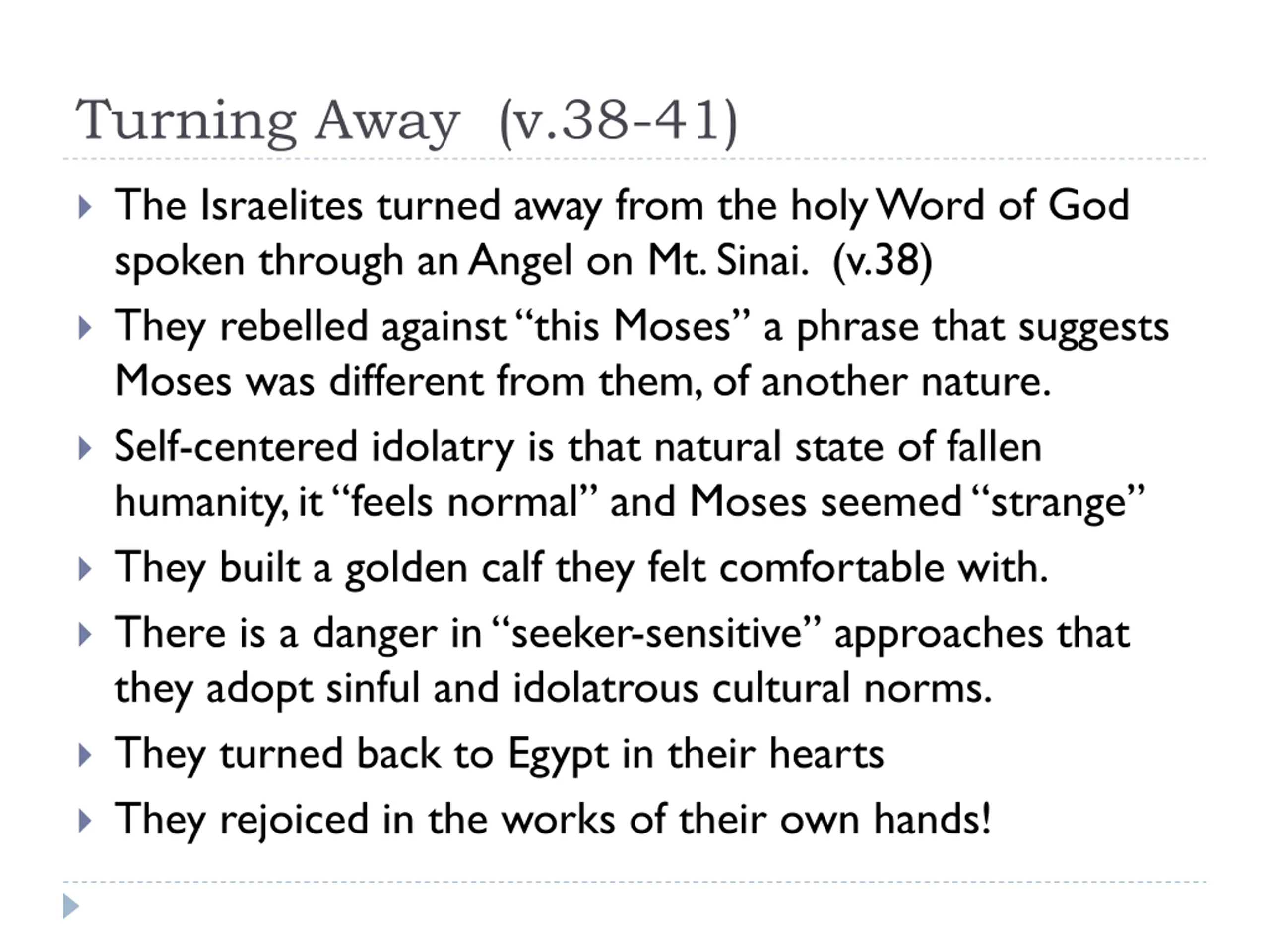 Turning Away (v.38-41) The Israelites turned away from the holy Word of God spoken through an Angel on Mt. Sinai. (v.38) They rebelled against this Moses a phrase that suggests Moses was different from them, of another nature. Self-centered idolatry is that natural state of fallen humanity, it feels normal and Moses seemed strange They built a golden calf they felt comfortable with. There is a danger in seeker-sensitive approaches that they adopt sinful and idolatrous cultural norms. They turned back to Egypt in their hearts They rejoiced in the works of their own hands!