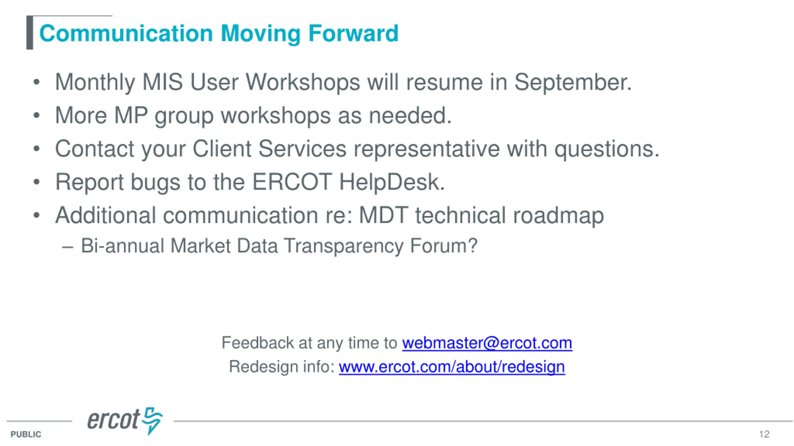 Communication Moving Forward Monthly MIS User Workshops will resume in September. More MP group workshops as needed. Contact your Client Services representative with questions. Report bugs to the ERCOT HelpDesk. Additional communication re: MDT technical roadmap Bi-annual Market Data Transparency Forum? Feedback at any time to webmaster@ercot.com Redesign info: www.ercot.com/about/redesign 12 PUBLIC