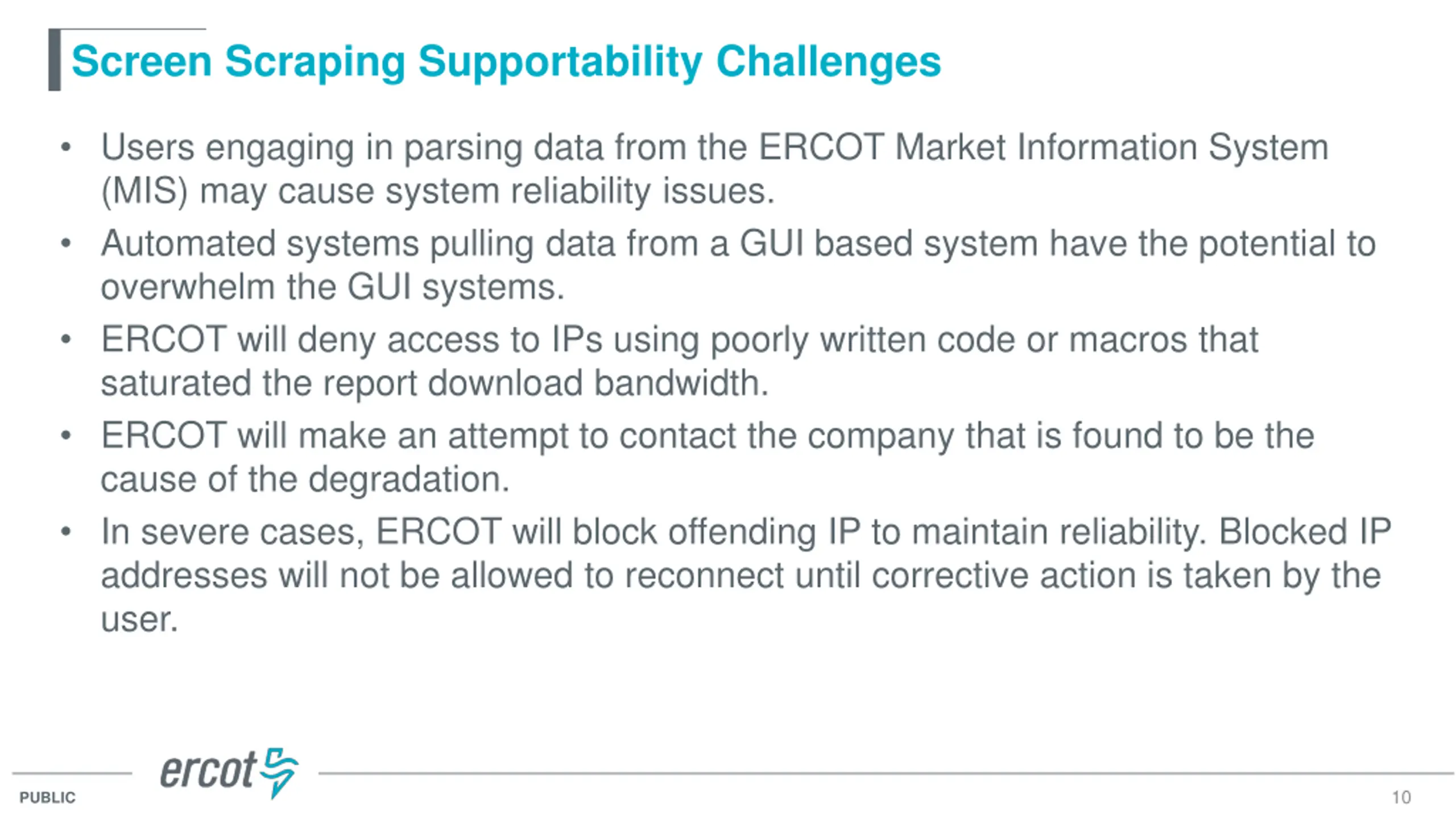 Screen Scraping Supportability Challenges Users engaging in parsing data from the ERCOT Market Information System (MIS) may cause system reliability issues. Automated systems pulling data from a GUI based system have the potential to overwhelm the GUI systems. ERCOT will deny access to IPs using poorly written code or macros that saturated the report download bandwidth. ERCOT will make an attempt to contact the company that is found to be the cause of the degradation. In severe cases, ERCOT will block offending IP to maintain reliability. Blocked IP addresses will not be allowed to reconnect until corrective action is taken by the user. 10 PUBLIC