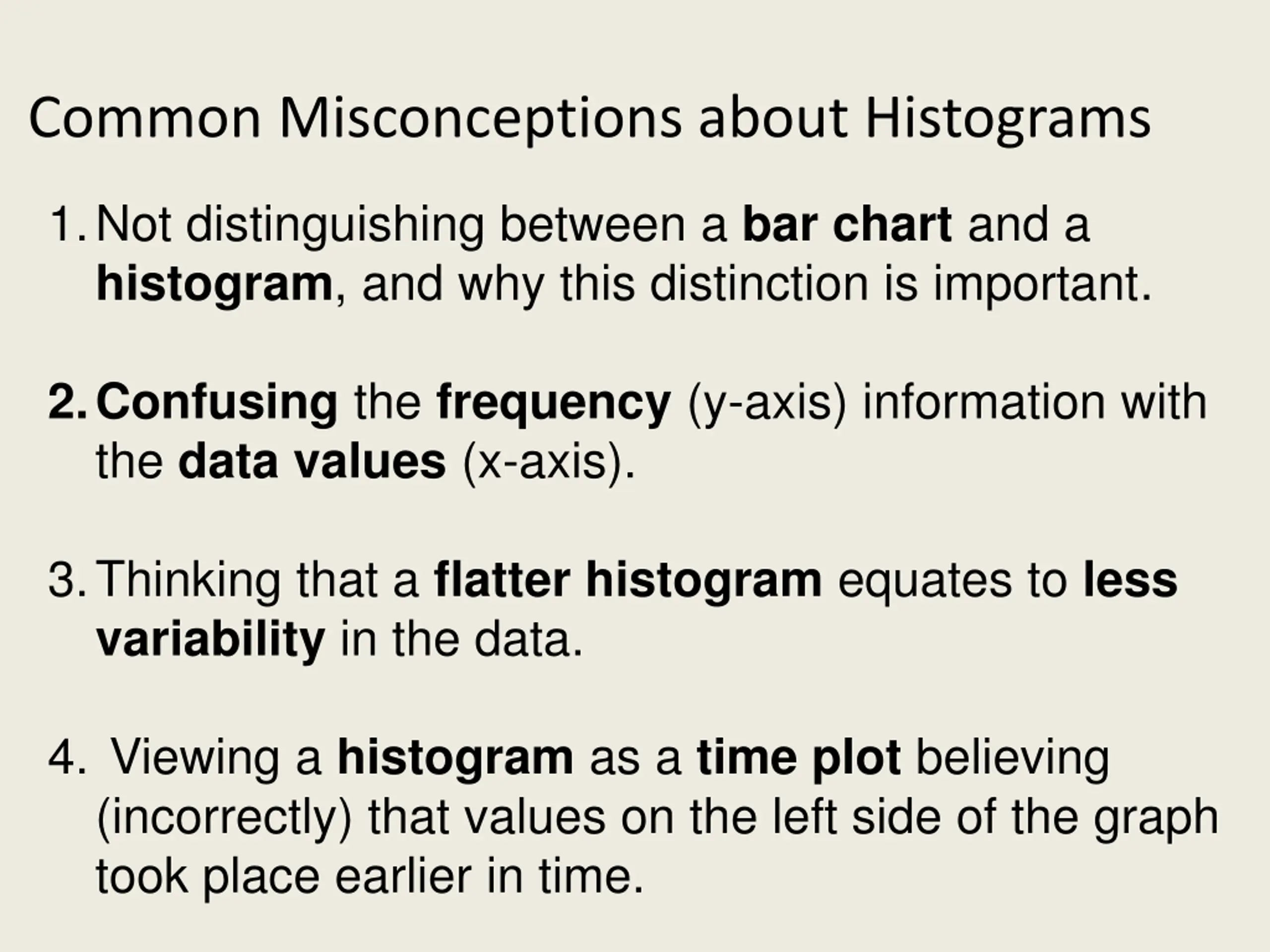 Common Misconceptions about Histograms 1. Not distinguishing between a bar chart and a histogram, and why this distinction is important. 2.Confusing the frequency (y-axis) information with the data values (x-axis). 3.Thinking that a flatter histogram equates to less variability in the data. 4. Viewing a histogram as a time plot believing (incorrectly) that values on the left side of the graph took place earlier in time.