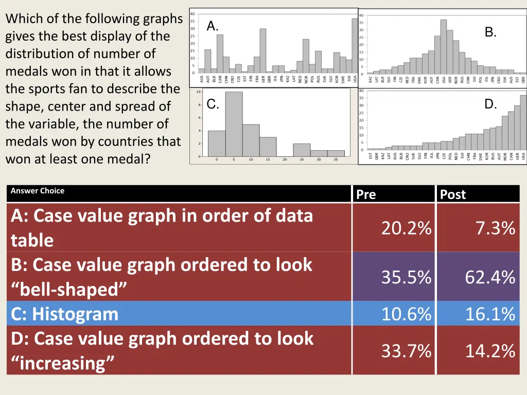 Which of the following graphs gives the best display of the distribution of number of medals won in that it allows the sports fan to describe the shape, center and spread of the variable, the number of medals won by countries that won at least one medal? A. B. 10 C. D. 8 6 4 2 0 0 5 10 15 20 25 30 35 Answer Choice Pre Post A: Case value graph in order of data table B: Case value graph ordered to look bell-shaped C: Histogram D: Case value graph ordered to look increasing 20.2% 7.3% 35.5% 62.4% 10.6% 16.1% 33.7% 14.2%