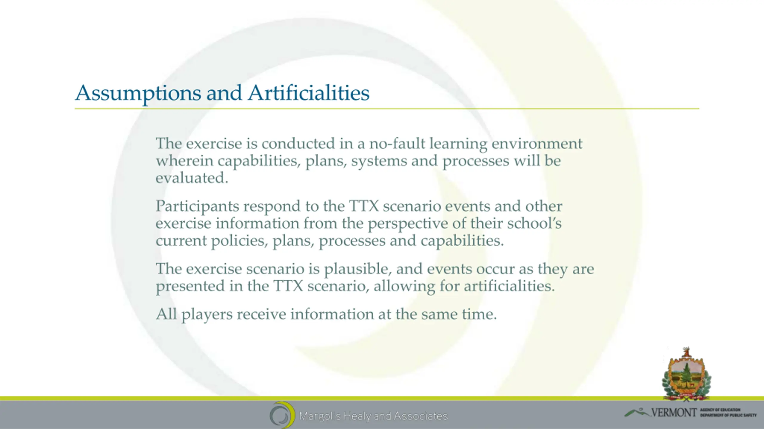 Assumptions and Artificialities The exercise is conducted in a no-fault learning environment wherein capabilities, plans, systems and processes will be evaluated. Participants respond to the TTX scenario events and other exercise information from the perspective of their school s current policies, plans, processes and capabilities. The exercise scenario is plausible, and events occur as they are presented in the TTX scenario, allowing for artificialities. All players receive information at the same time.