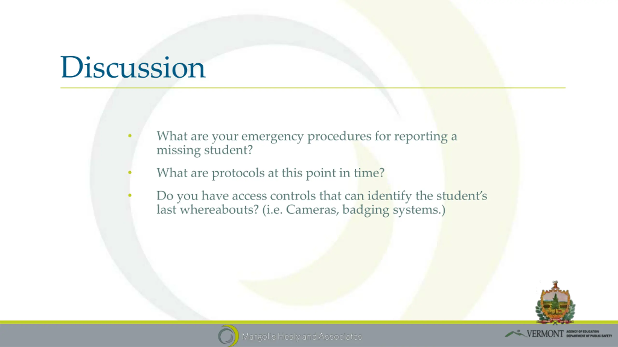 Discussion What are your emergency procedures for reporting a missing student? What are protocols at this point in time? Do you have access controls that can identify the student s last whereabouts? (i.e. Cameras, badging systems.)