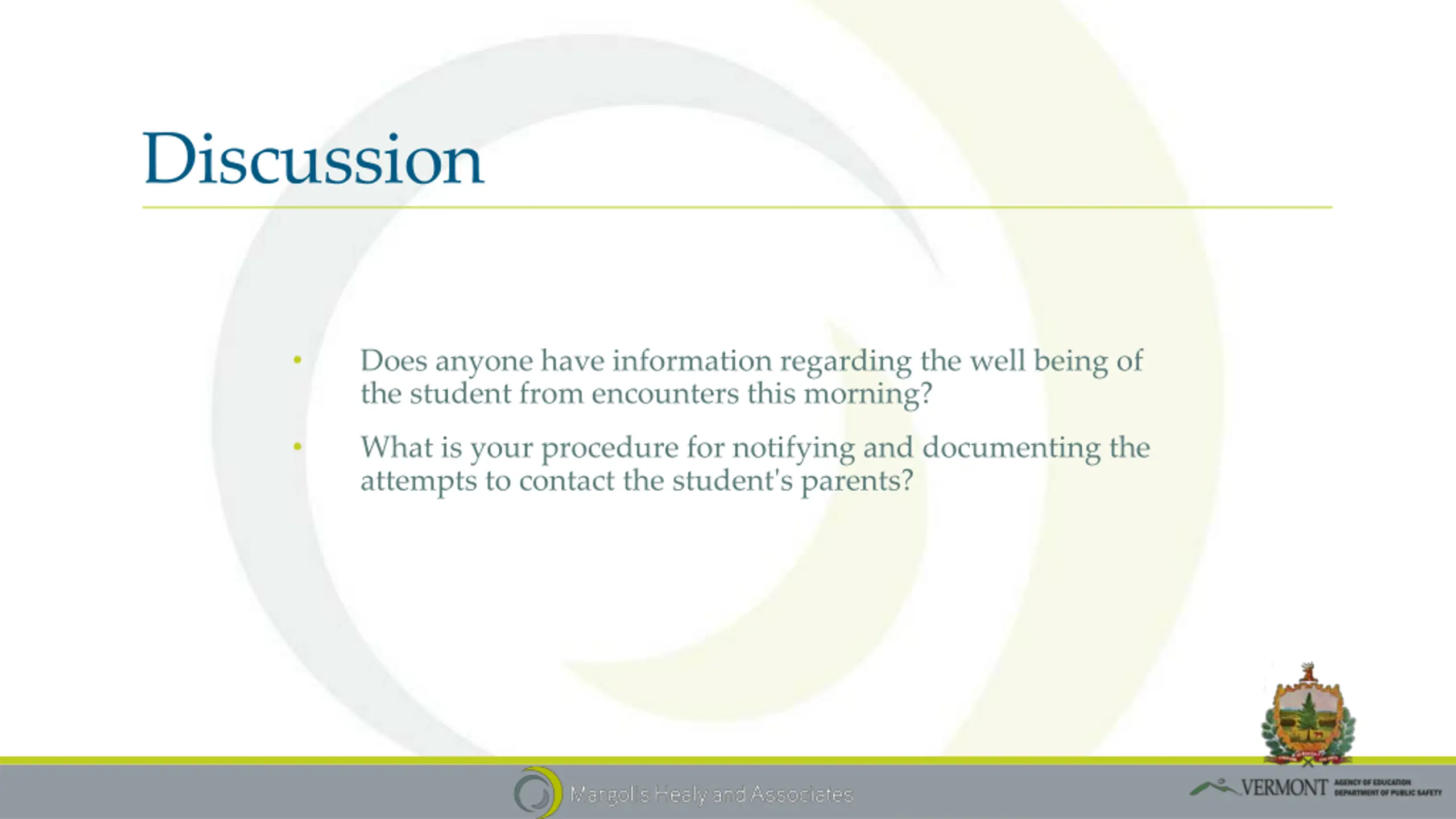 Discussion Does anyone have information regarding the well being of the student from encounters this morning? What is your procedure for notifying and documenting the attempts to contact the student's parents?