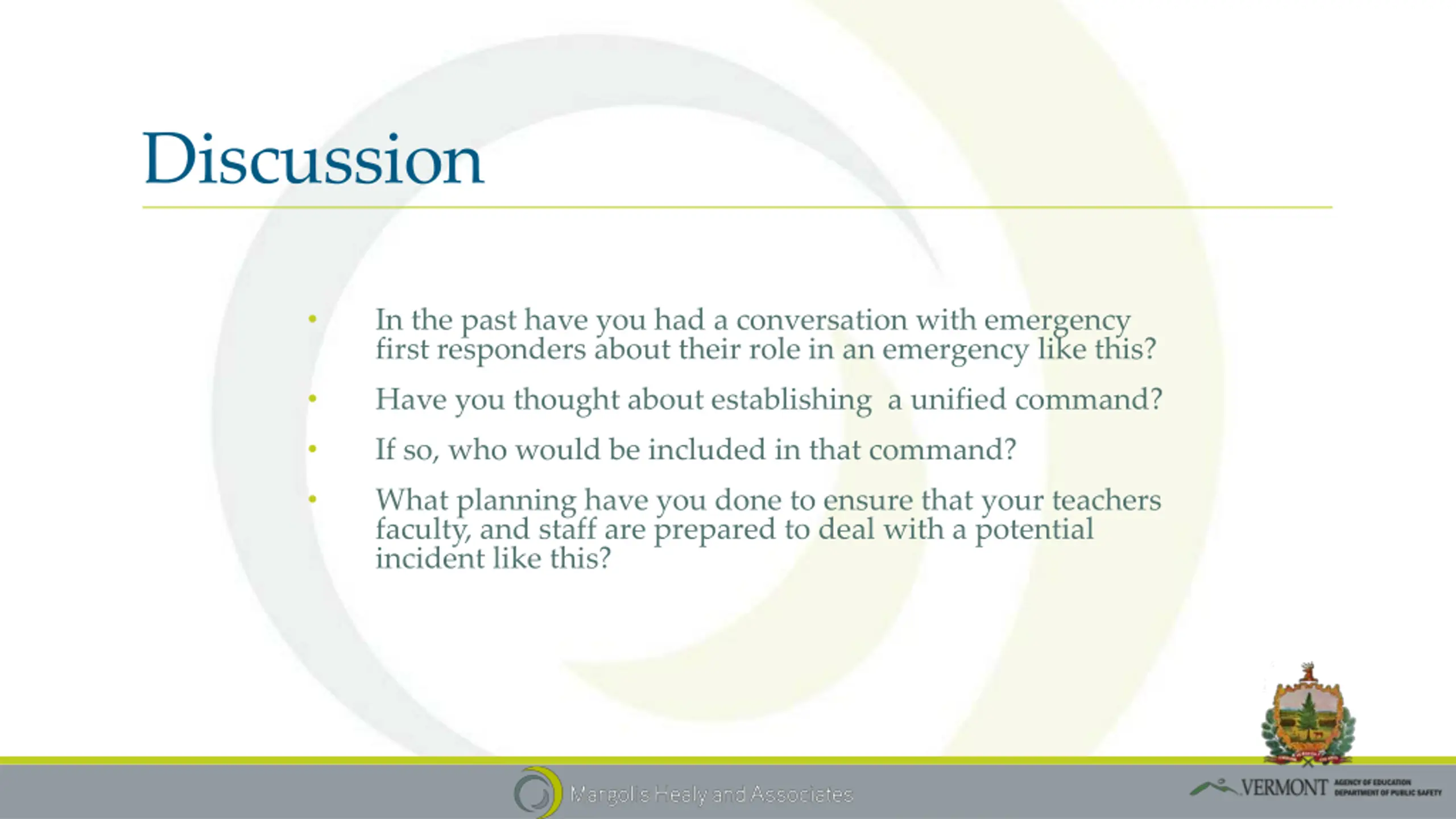 Discussion In the past have you had a conversation with emergency first responders about their role in an emergency like this? Have you thought about establishing a unified command? If so, who would be included in that command? What planning have you done to ensure that your teachers faculty, and staff are prepared to deal with a potential incident like this?