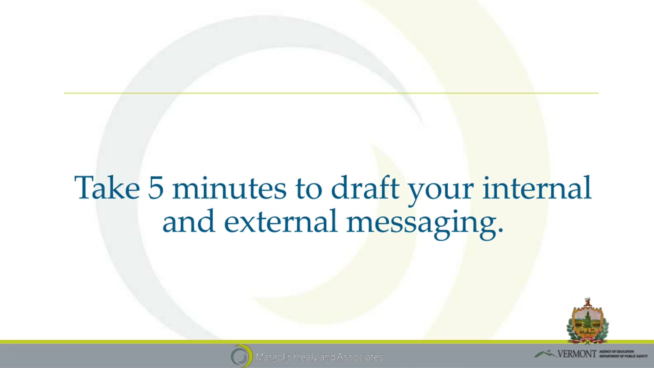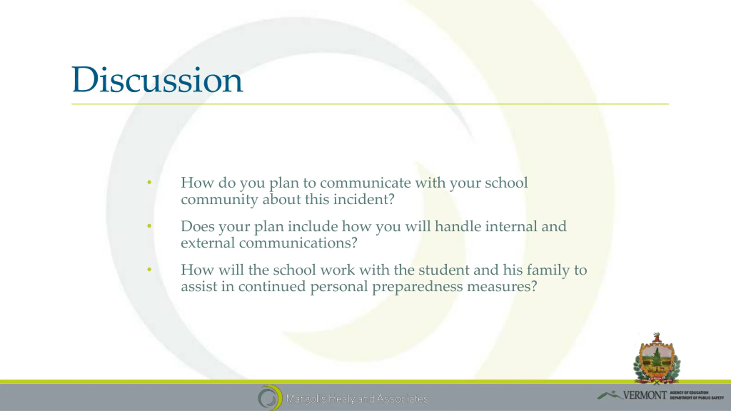 Discussion How do you plan to communicate with your school community about this incident? Does your plan include how you will handle internal and external communications? How will the school work with the student and his family to assist in continued personal preparedness measures?