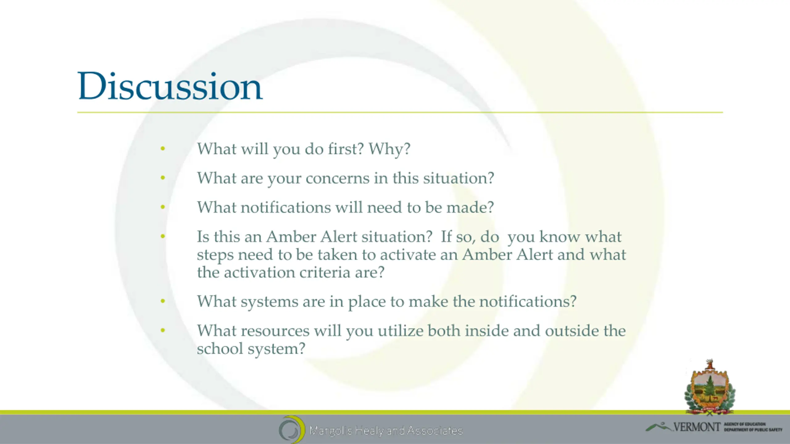 Discussion What will you do first? Why? What are your concerns in this situation? What notifications will need to be made? Is this an Amber Alert situation? If so, do you know what steps need to be taken to activate an Amber Alert and what the activation criteria are? What systems are in place to make the notifications? What resources will you utilize both inside and outside the school system?