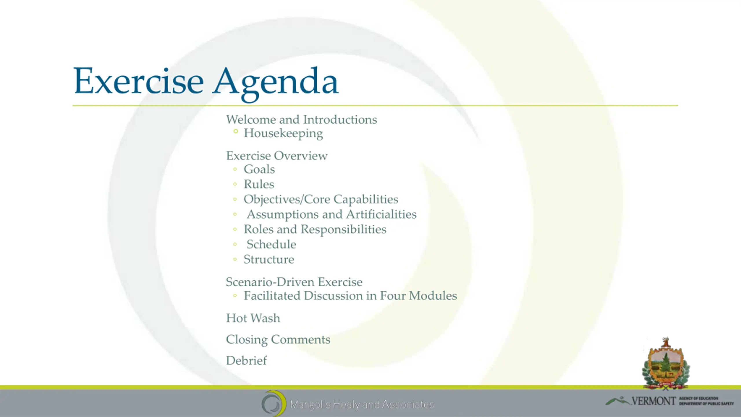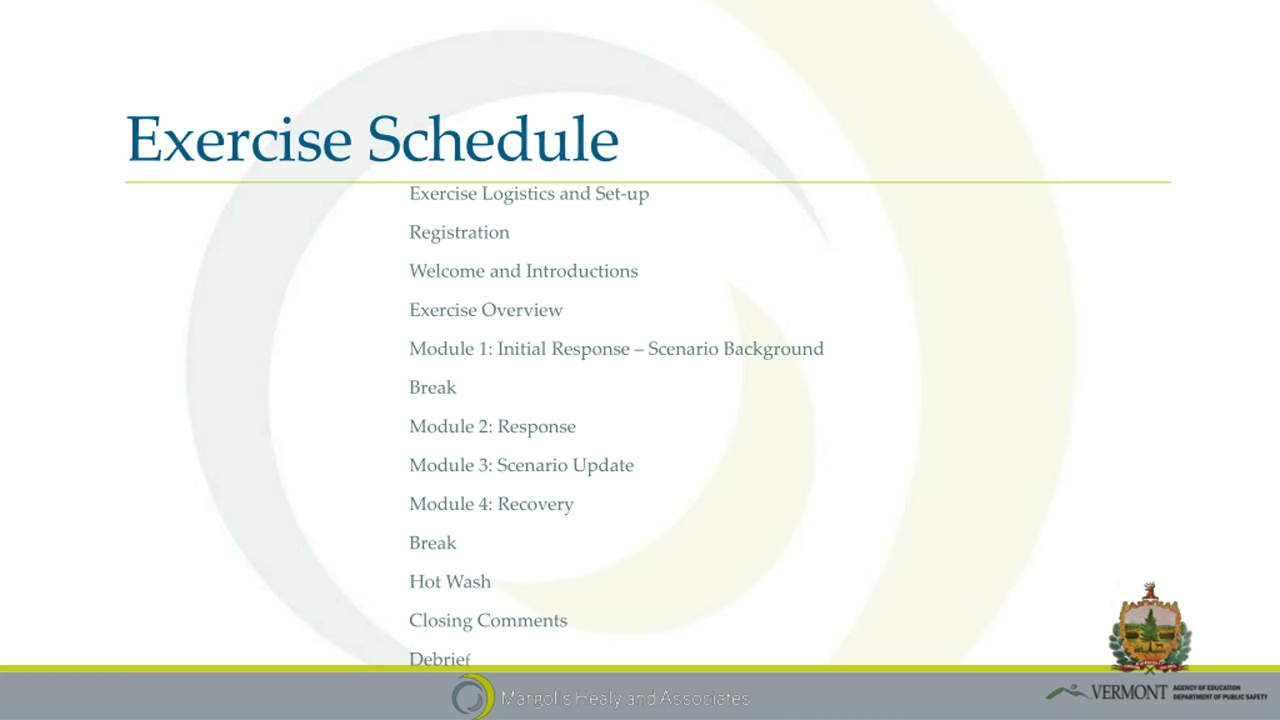 Exercise Schedule Exercise Logistics and Set-up Registration Welcome and Introductions Exercise Overview Module 1: Initial Response Scenario Background Break Module 2: Response Module 3: Scenario Update Module 4: Recovery Break Hot Wash Closing Comments Debrief