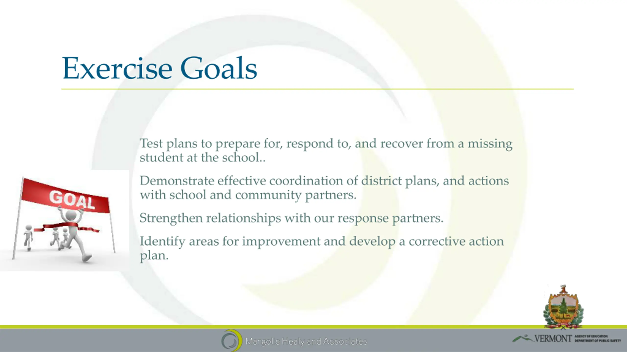 Exercise Goals Test plans to prepare for, respond to, and recover from a missing student at the school.. Demonstrate effective coordination of district plans, and actions with school and community partners. Strengthen relationships with our response partners. Identify areas for improvement and develop a corrective action plan.