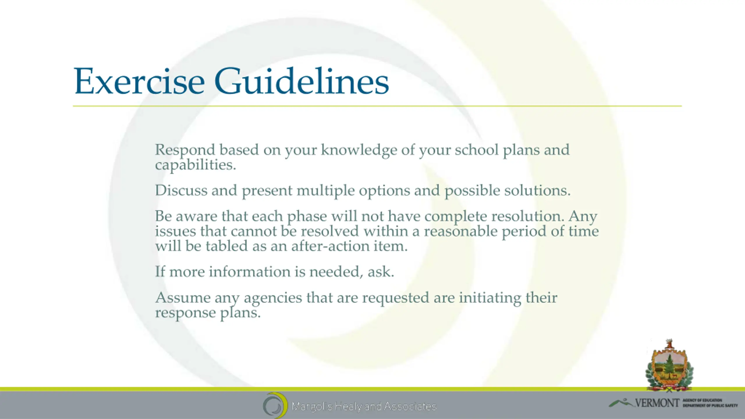 Exercise Guidelines Respond based on your knowledge of your school plans and capabilities. Discuss and present multiple options and possible solutions. Be aware that each phase will not have complete resolution. Any issues that cannot be resolved within a reasonable period of time will be tabled as an after-action item. If more information is needed, ask. Assume any agencies that are requested are initiating their response plans.