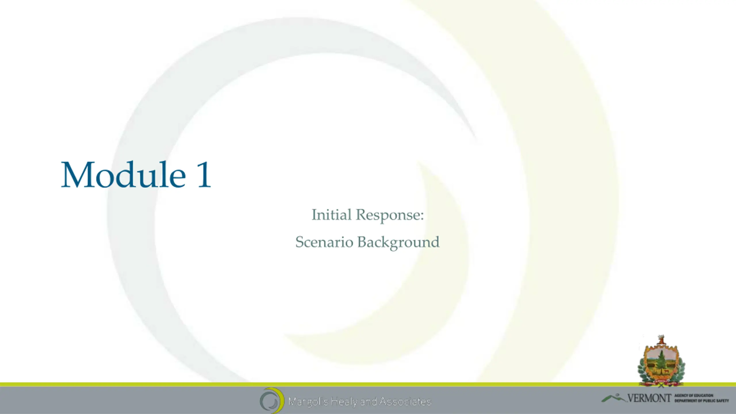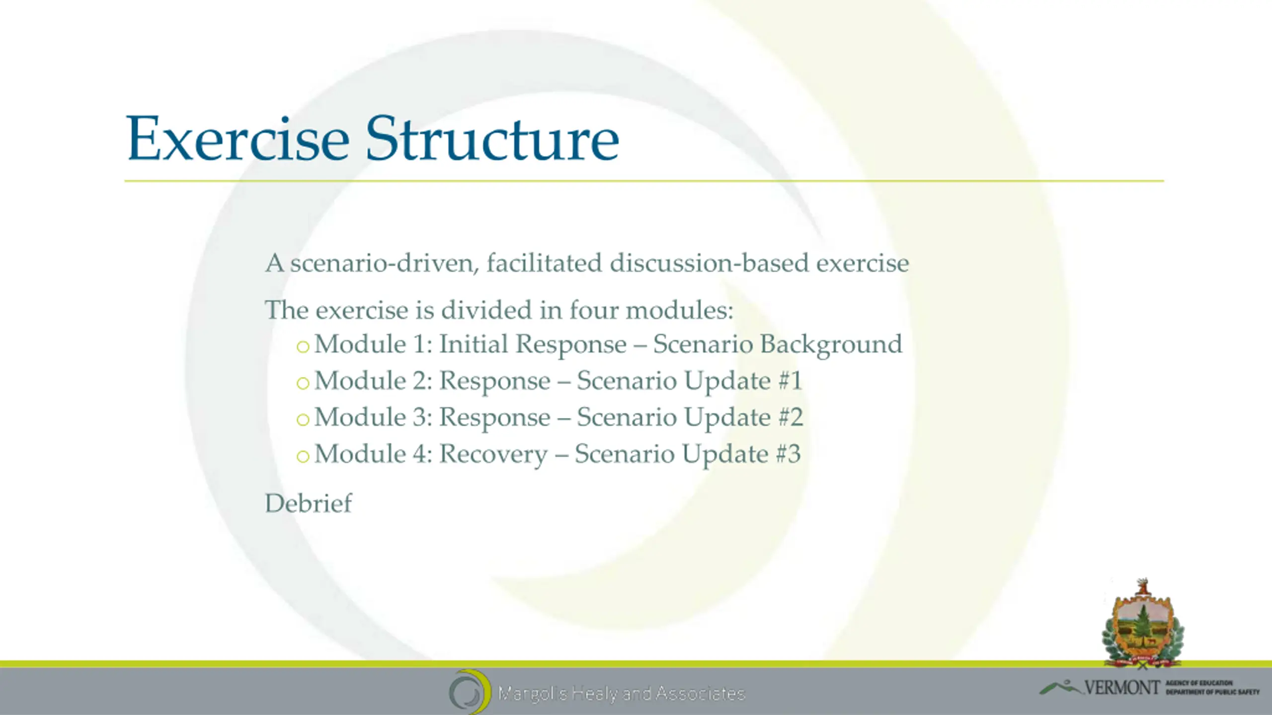 Exercise Structure A scenario-driven, facilitated discussion-based exercise The exercise is divided in four modules: oModule 1: Initial Response Scenario Background oModule 2: Response Scenario Update #1 oModule 3: Response Scenario Update #2 oModule 4: Recovery Scenario Update #3 Debrief