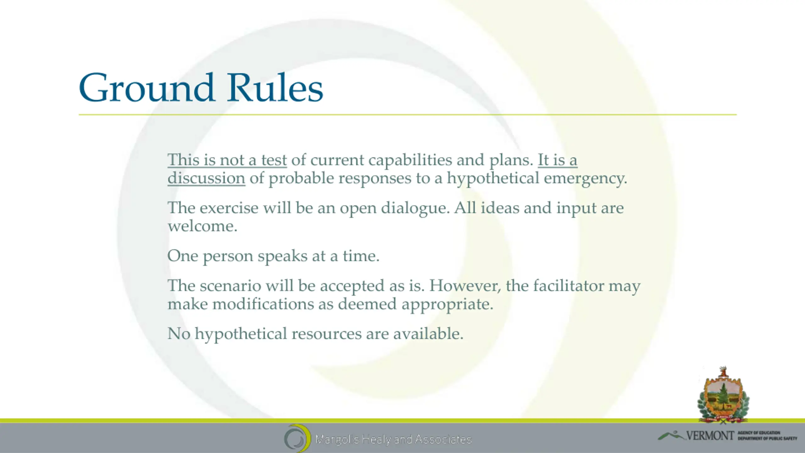 Ground Rules This is not a test of current capabilities and plans. It is a discussion of probable responses to a hypothetical emergency. The exercise will be an open dialogue. All ideas and input are welcome. One person speaks at a time. The scenario will be accepted as is. However, the facilitator may make modifications as deemed appropriate. No hypothetical resources are available.