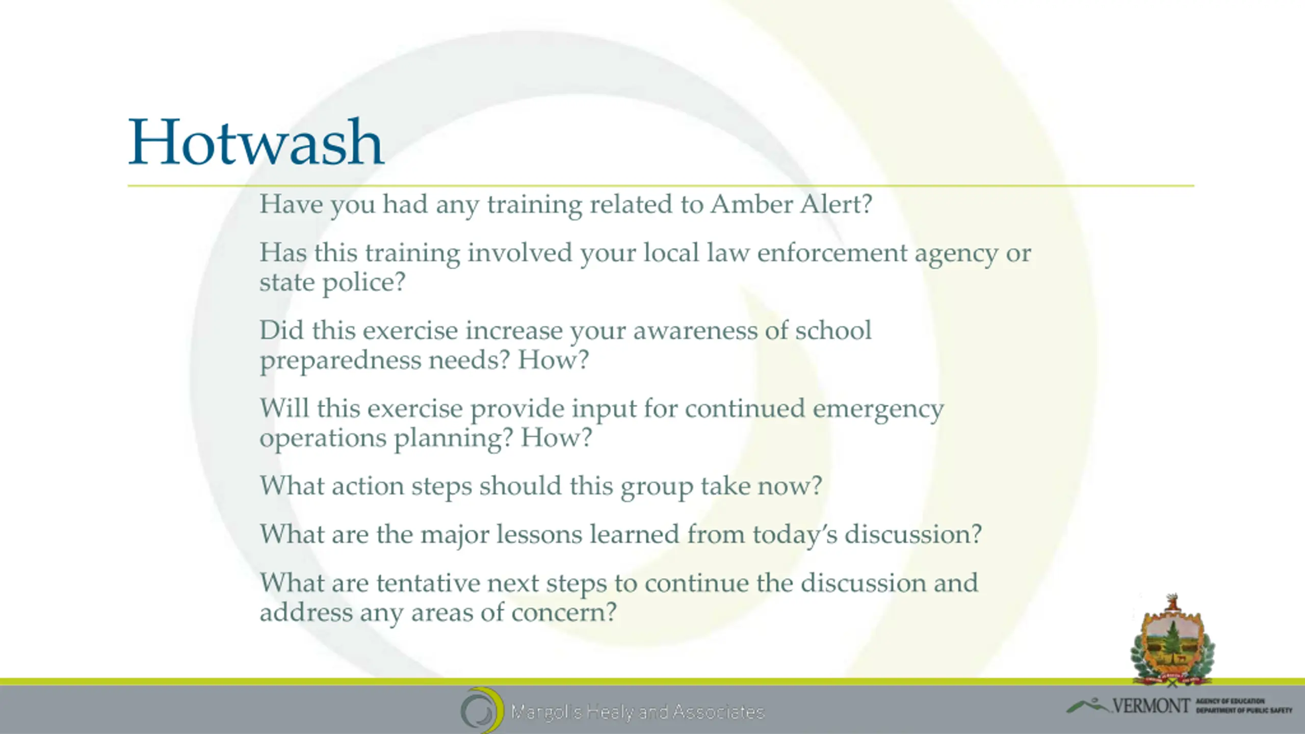 Hotwash Have you had any training related to Amber Alert? Has this training involved your local law enforcement agency or state police? Did this exercise increase your awareness of school preparedness needs? How? Will this exercise provide input for continued emergency operations planning? How? What action steps should this group take now? What are the major lessons learned from today s discussion? What are tentative next steps to continue the discussion and address any areas of concern?
