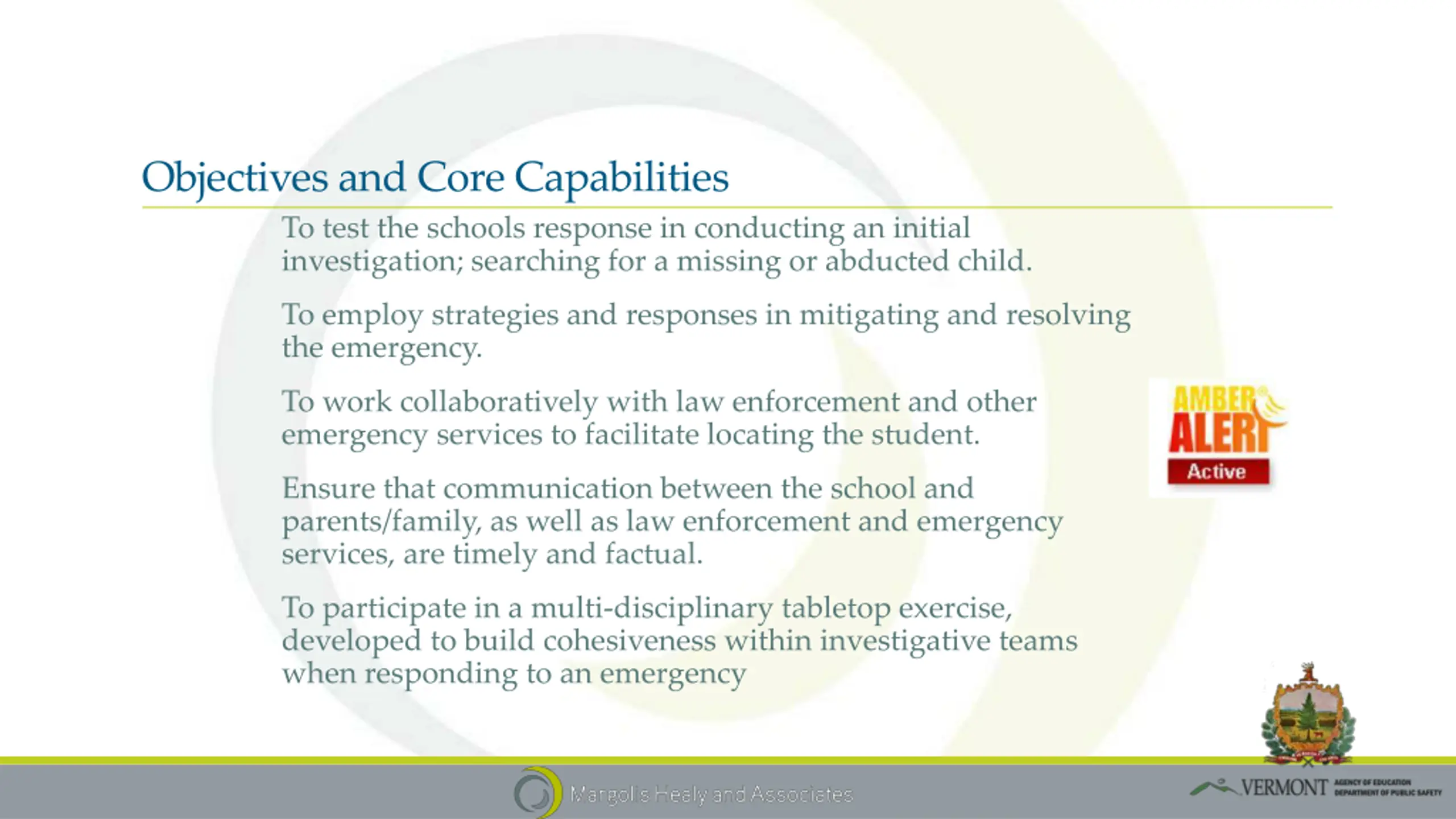 Objectives and Core Capabilities To test the schools response in conducting an initial investigation; searching for a missing or abducted child. To employ strategies and responses in mitigating and resolving the emergency. To work collaboratively with law enforcement and other emergency services to facilitate locating the student. Ensure that communication between the school and parents/family, as well as law enforcement and emergency services, are timely and factual. To participate in a multi-disciplinary tabletop exercise, developed to build cohesiveness within investigative teams when responding to an emergency
