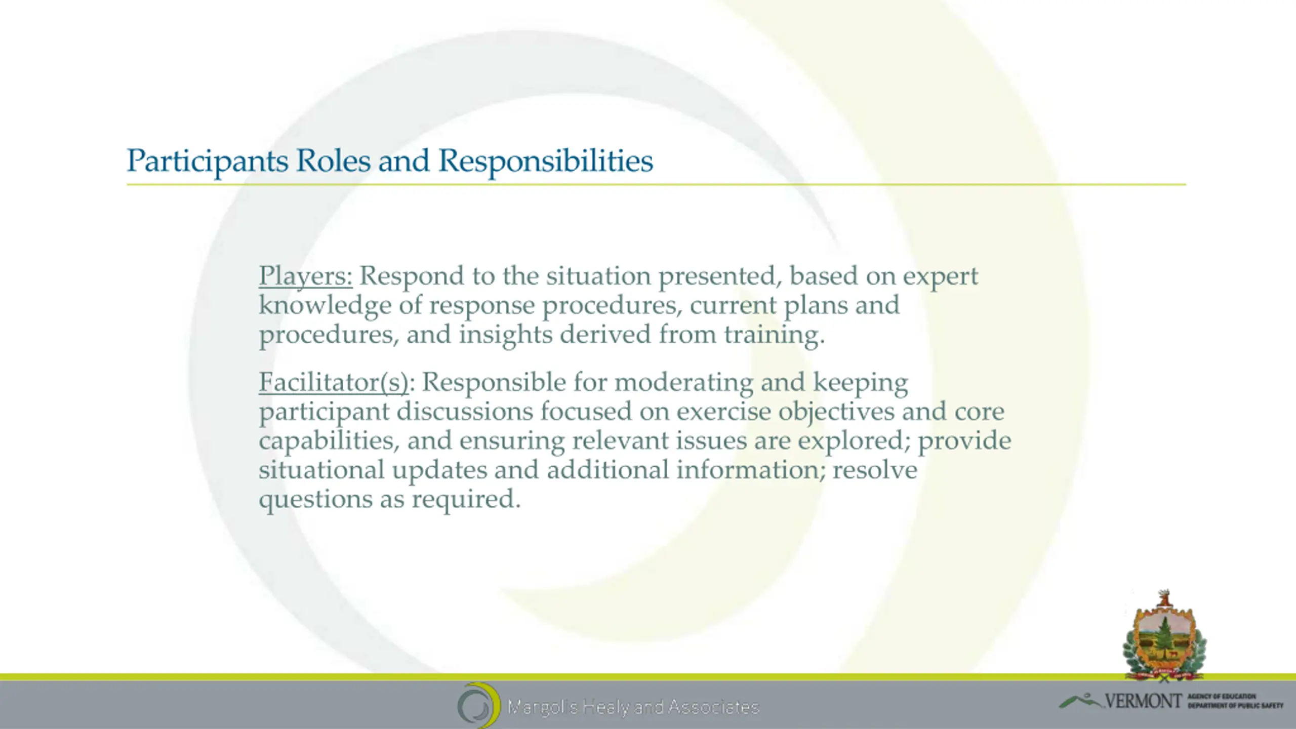 Participants Roles and Responsibilities Players: Respond to the situation presented, based on expert knowledge of response procedures, current plans and procedures, and insights derived from training. Facilitator(s): Responsible for moderating and keeping participant discussions focused on exercise objectives and core capabilities, and ensuring relevant issues are explored; provide situational updates and additional information; resolve questions as required.