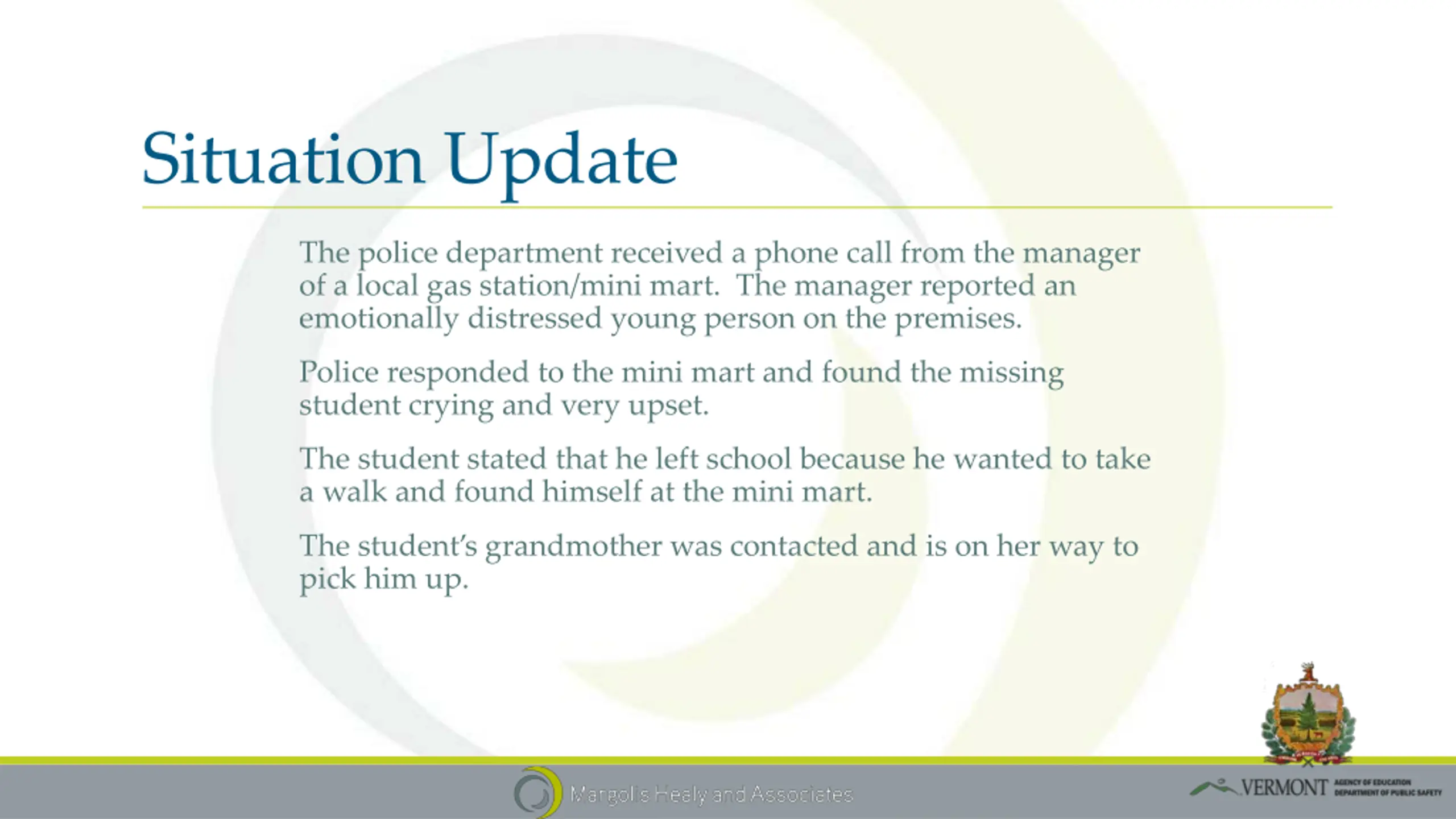 Situation Update The police department received a phone call from the manager of a local gas station/mini mart. The manager reported an emotionally distressed young person on the premises. Police responded to the mini mart and found the missing student crying and very upset. The student stated that he left school because he wanted to take a walk and found himself at the mini mart. The student s grandmother was contacted and is on her way to pick him up.
