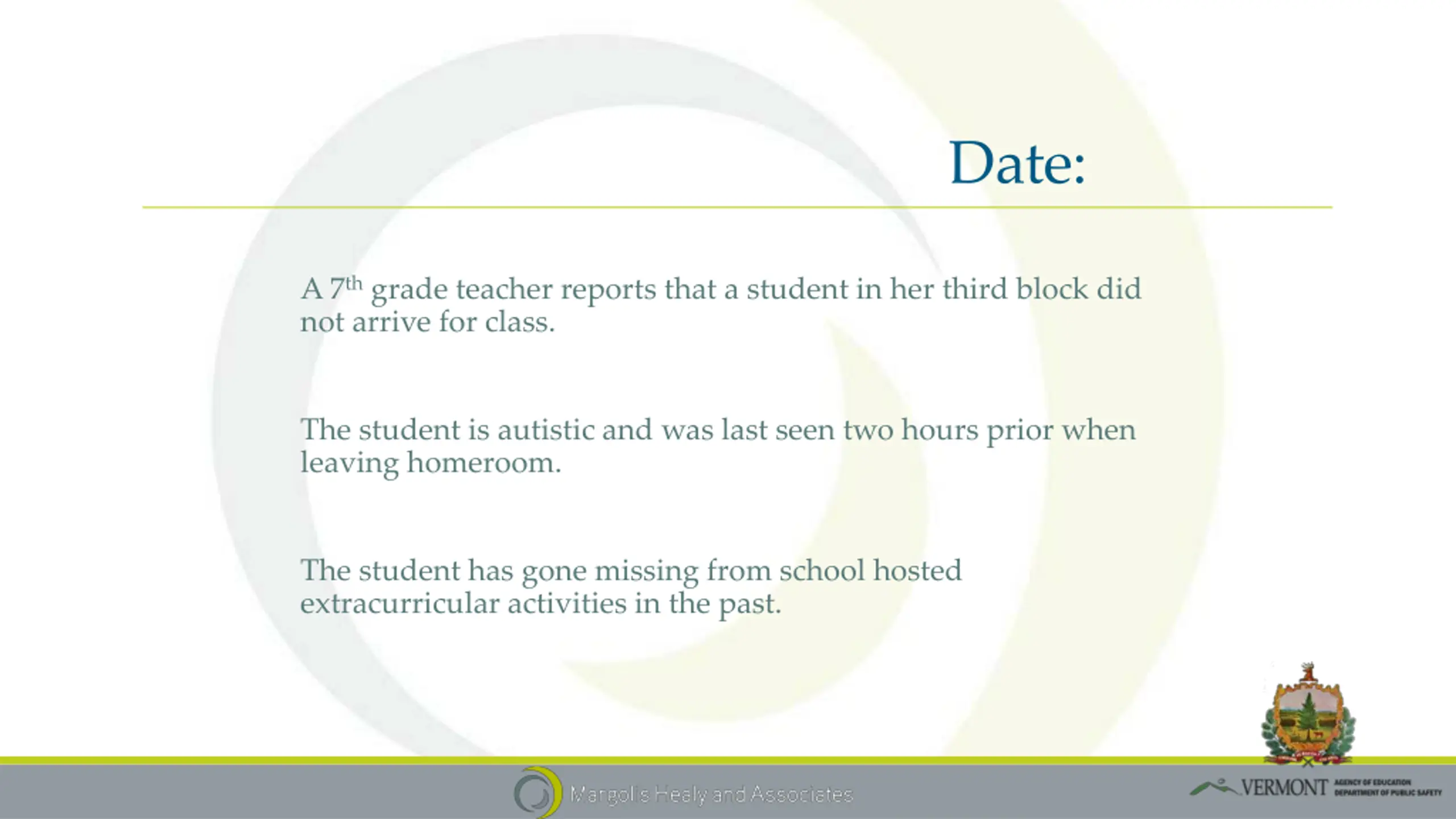 Date: A 7thgrade teacher reports that a student in her third block did not arrive for class. The student is autistic and was last seen two hours prior when leaving homeroom. The student has gone missing from school hosted extracurricular activities in the past.