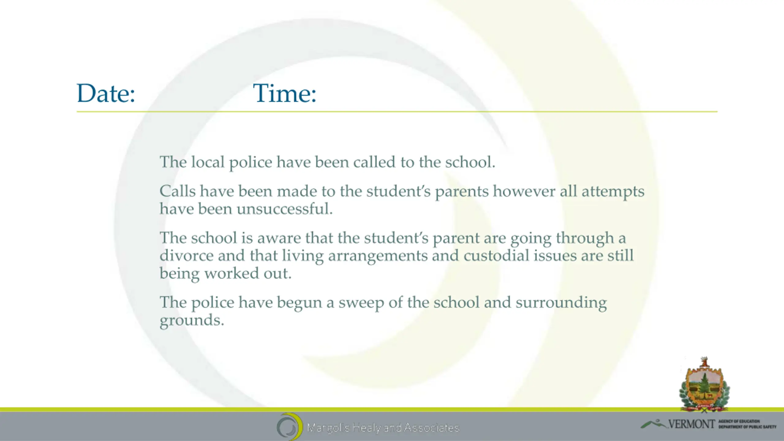 Date: Time: The local police have been called to the school. Calls have been made to the student s parents however all attempts have been unsuccessful. The school is aware that the student s parent are going through a divorce and that living arrangements and custodial issues are still being worked out. The police have begun a sweep of the school and surrounding grounds.