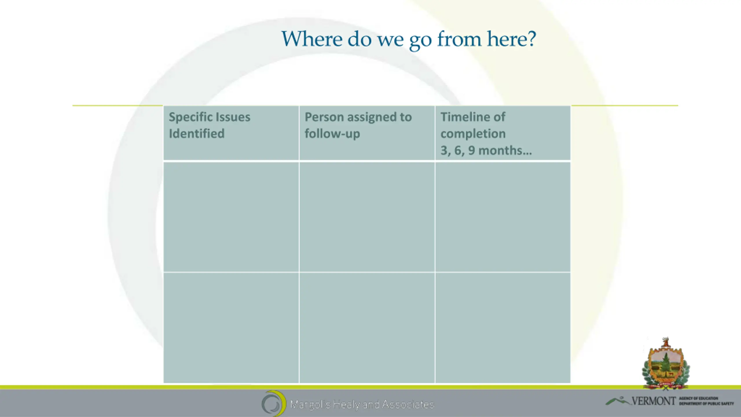 Where do we go from here? Specific Issues Identified Person assigned to follow-up Timeline of completion 3, 6, 9 months