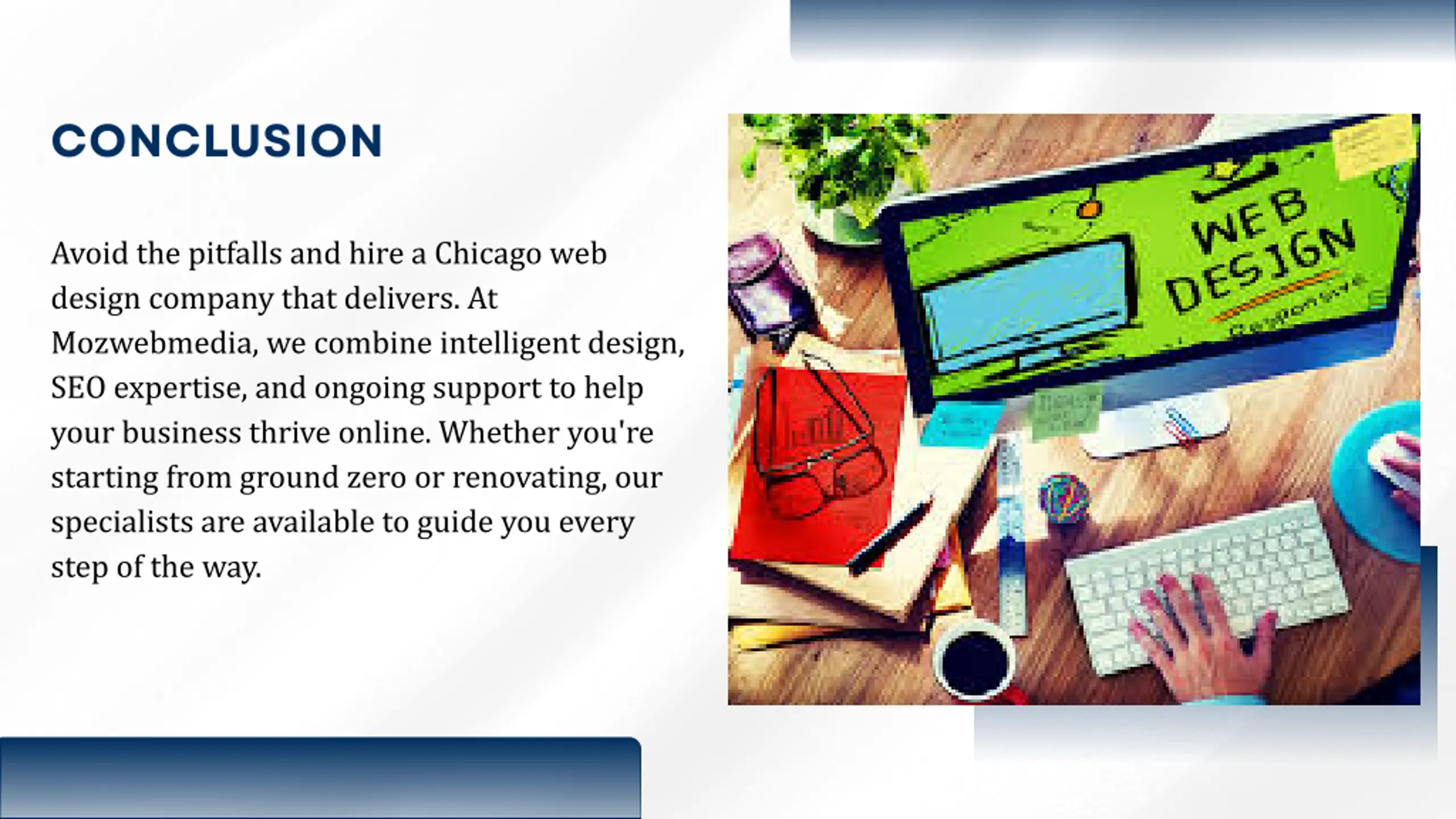 CONCLUSION Avoid the pitfalls and hire a Chicago web design company that delivers. At Mozwebmedia, we combine intelligent design, SEO expertise, and ongoing support to help your business thrive online. Whether you're starting from ground zero or renovating, our specialists are available to guide you every step of the way.