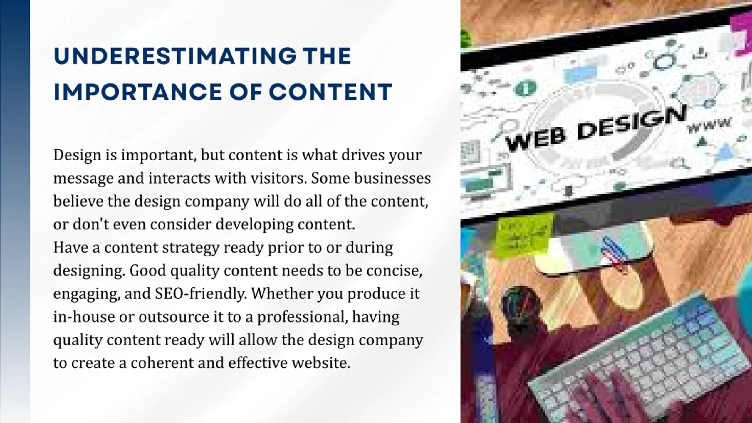 UNDERESTIMATING THE IMPORTANCE OF CONTENT Design is important, but content is what drives your message and interacts with visitors. Some businesses believe the design company will do all of the content, or don't even consider developing content. Have a content strategy ready prior to or during designing. Good quality content needs to be concise, engaging, and SEO-friendly. Whether you produce it in-house or outsource it to a professional, having quality content ready will allow the design company to create a coherent and effective website.